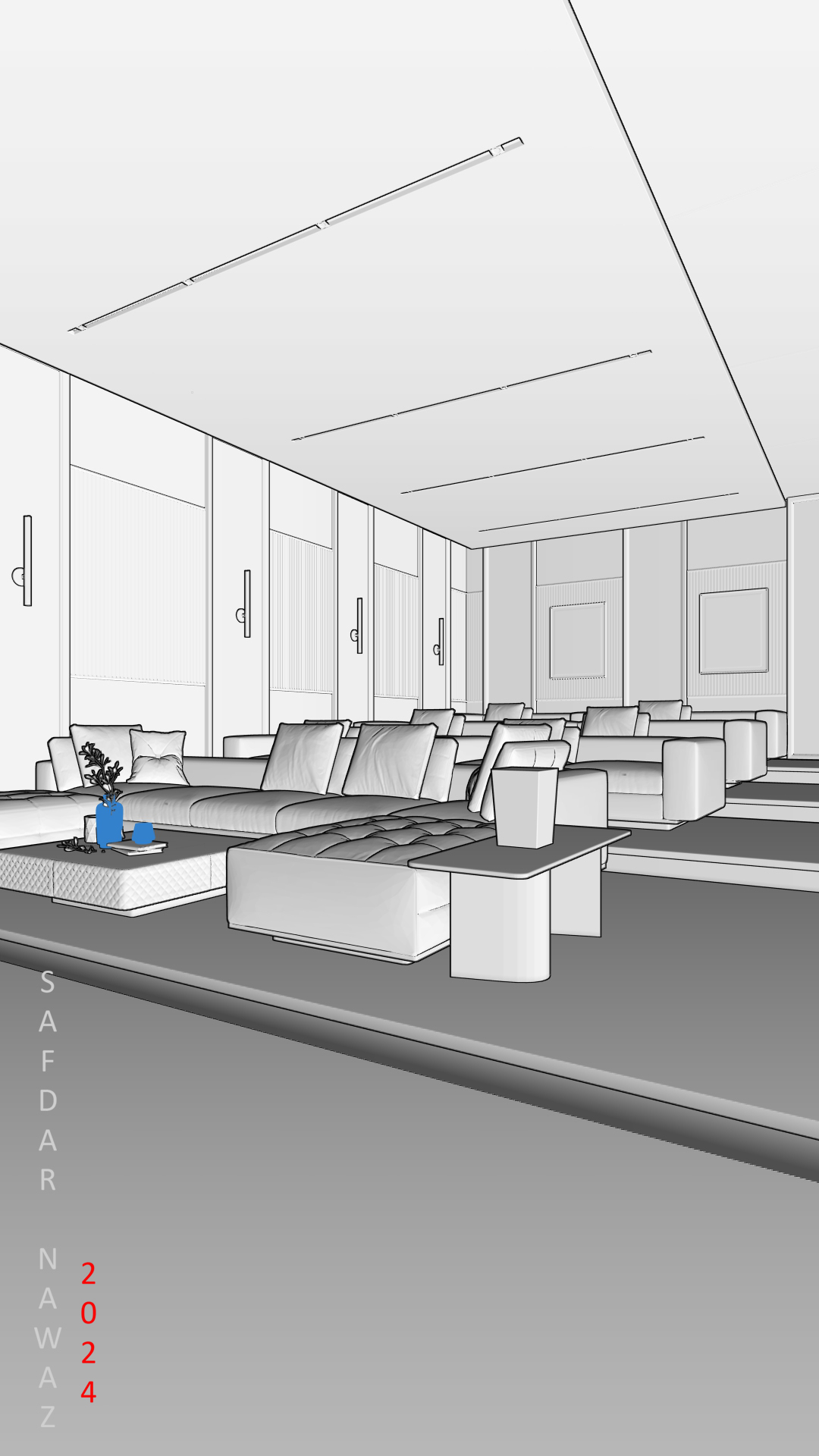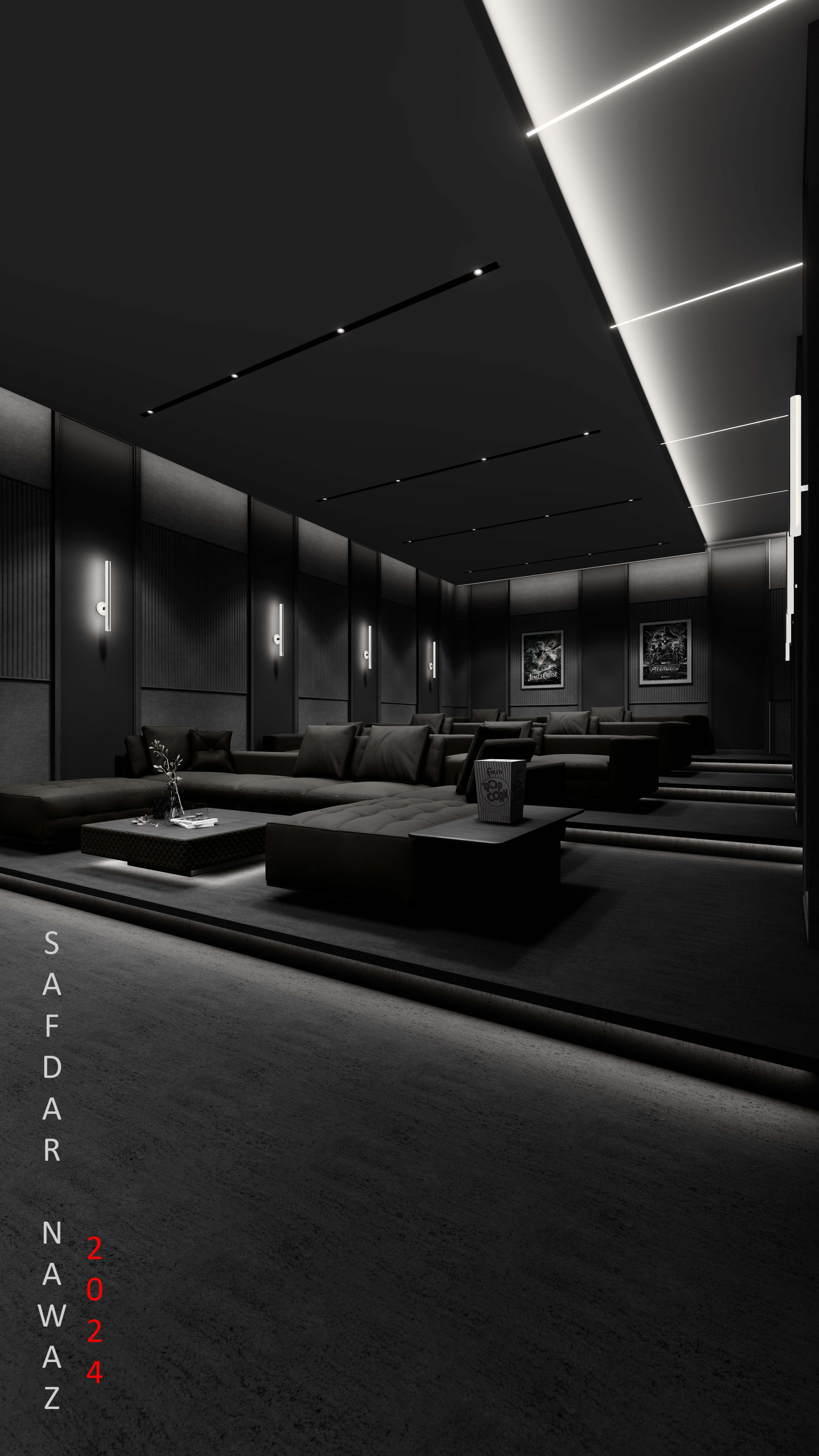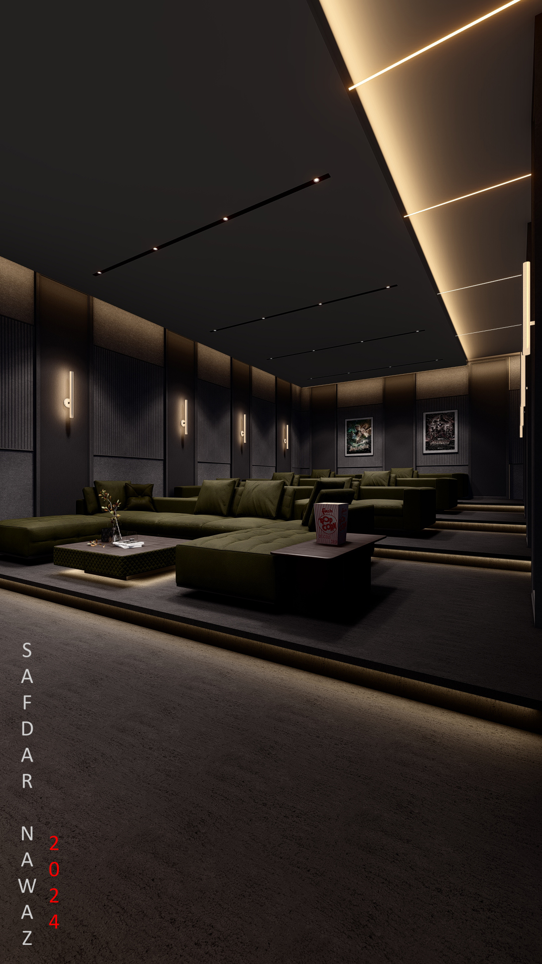 This image showcases a sophisticated and modern home theater design. The space features a plush, dark green sectional sofa, ambient lighting integrated seamlessly into the architecture, and a minimalist aesthetic. The overall design creates an immersive and luxurious cinematic experience. The use of subtle lighting and dark tones enhances the sense of privacy and comfort. This project demonstrates a masterful blend of form and function.