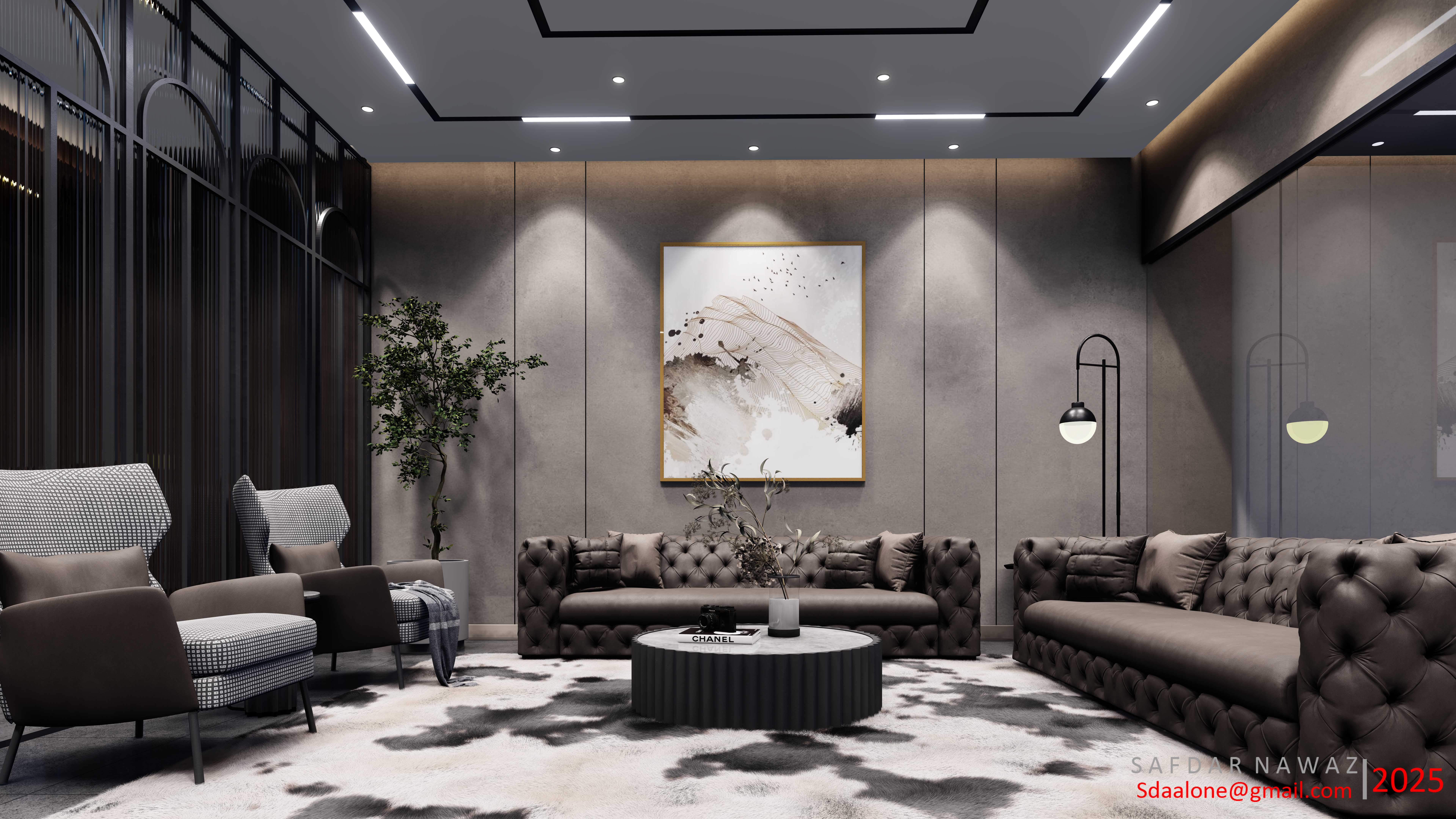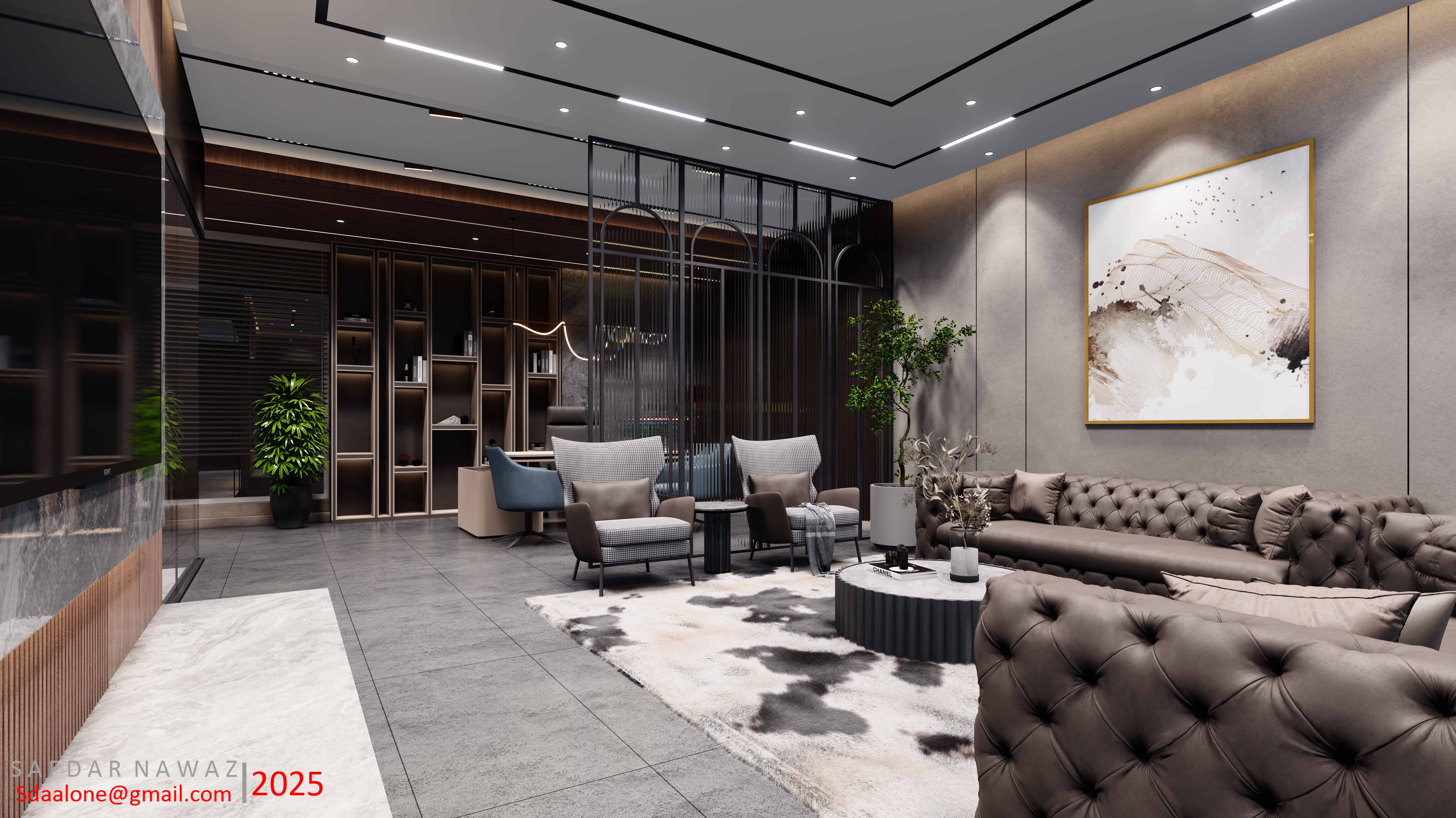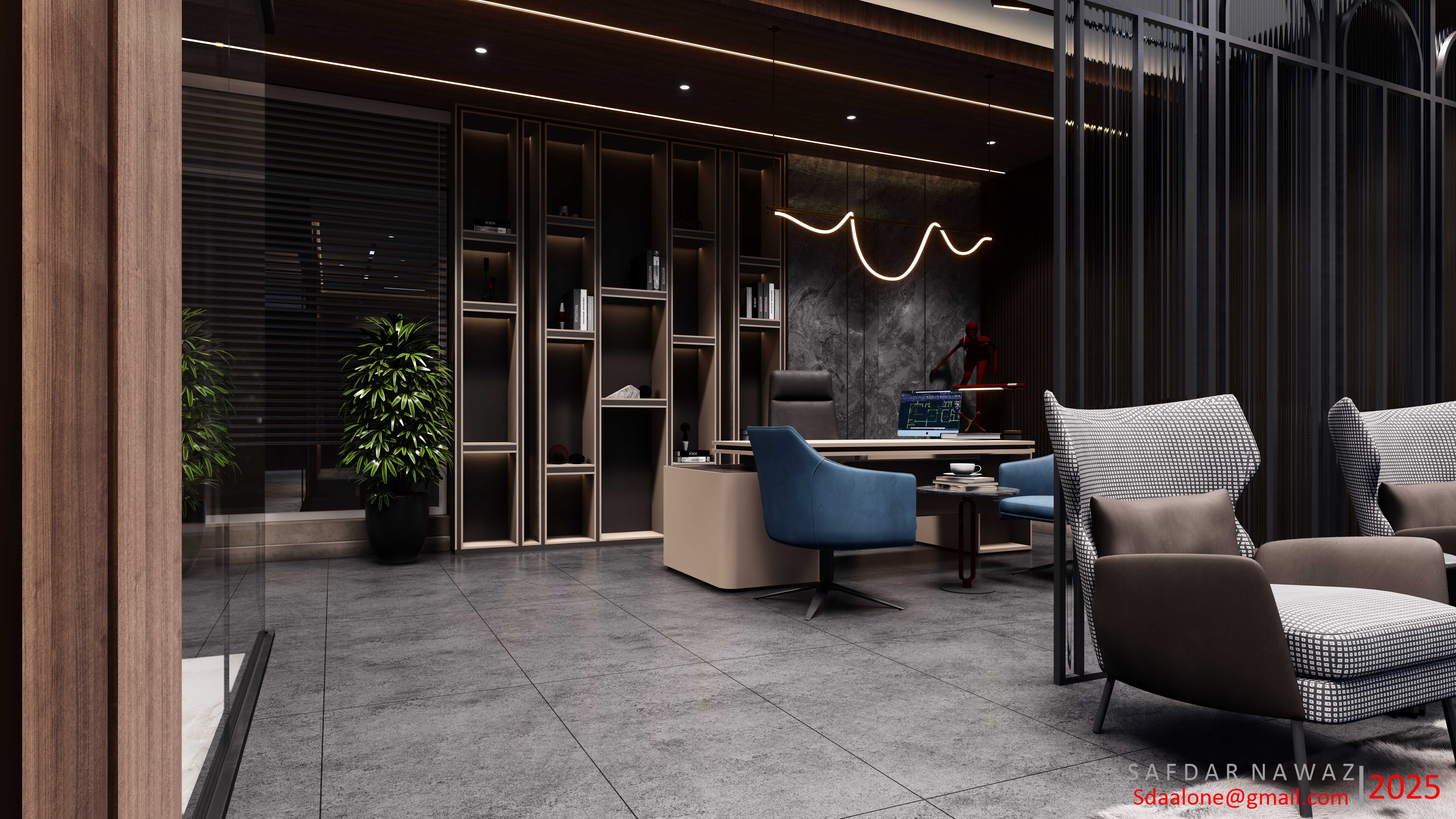 The space features a sleek, dark color palette accented with warm wood tones and metallic details. A custom built-in shelving unit provides ample storage, while comfortable seating and a large desk create a functional and inviting workspace. The strategic use of lighting enhances the overall ambiance. The design reflects a blend of contemporary style and functional elegance.
