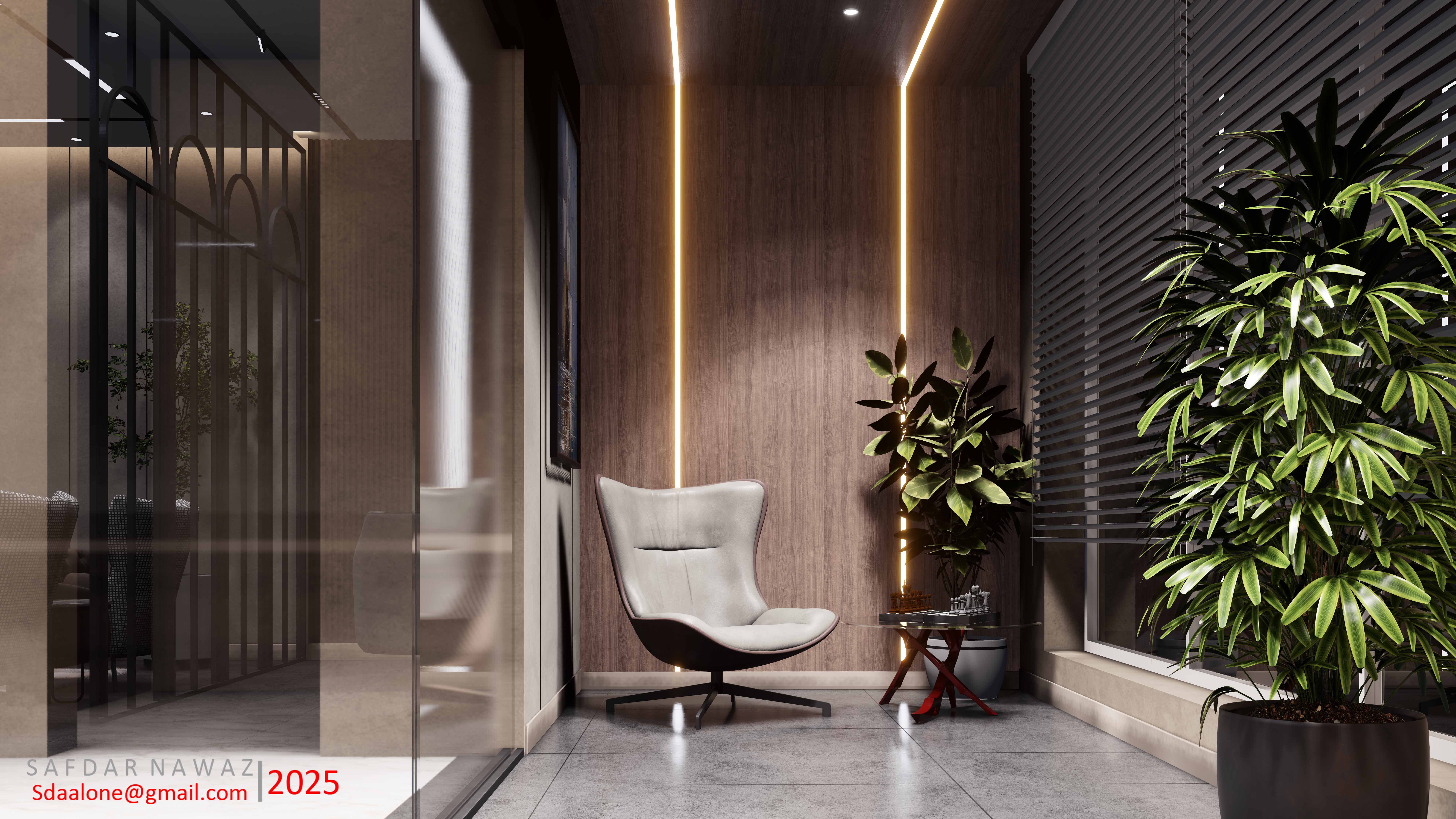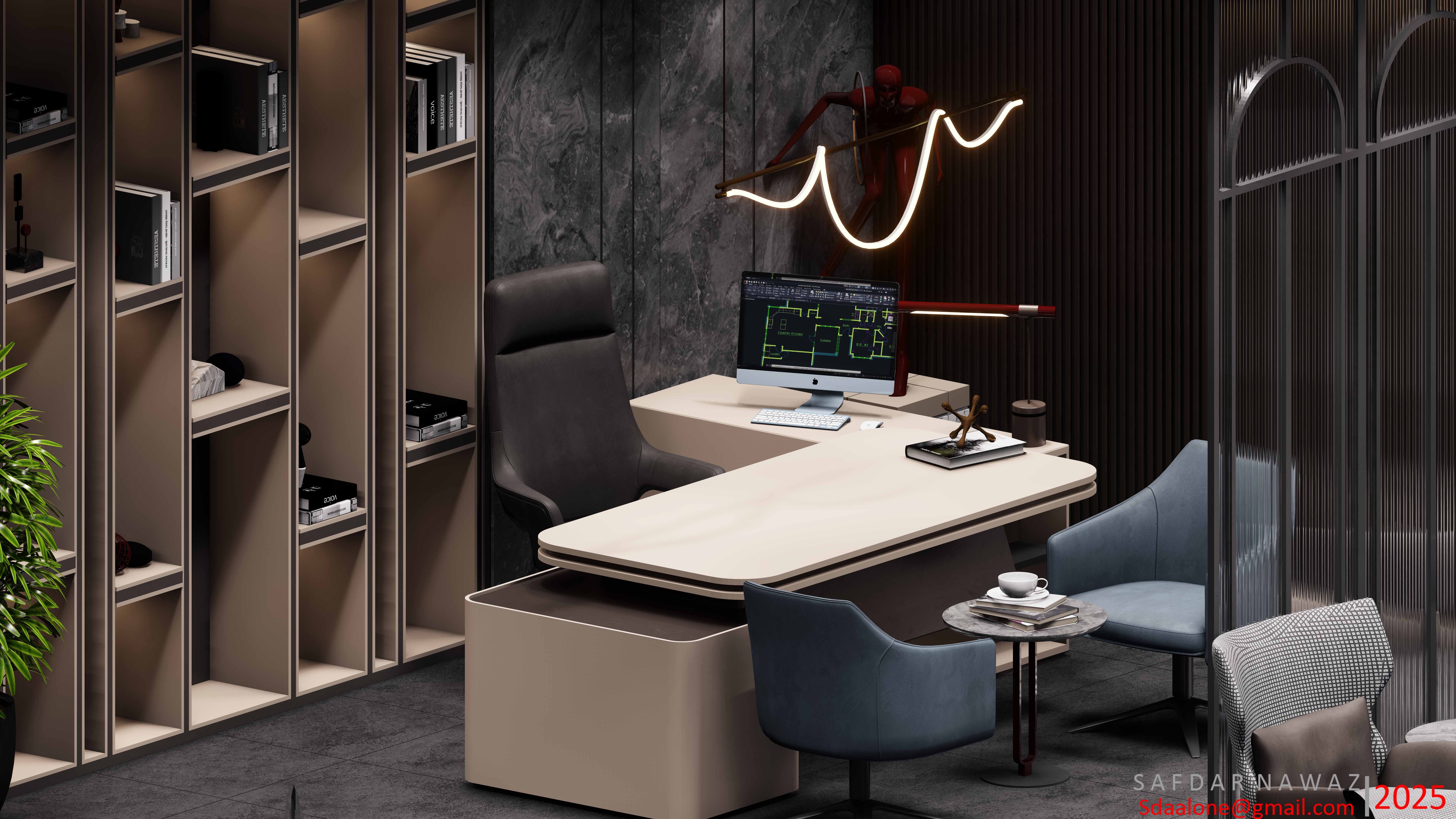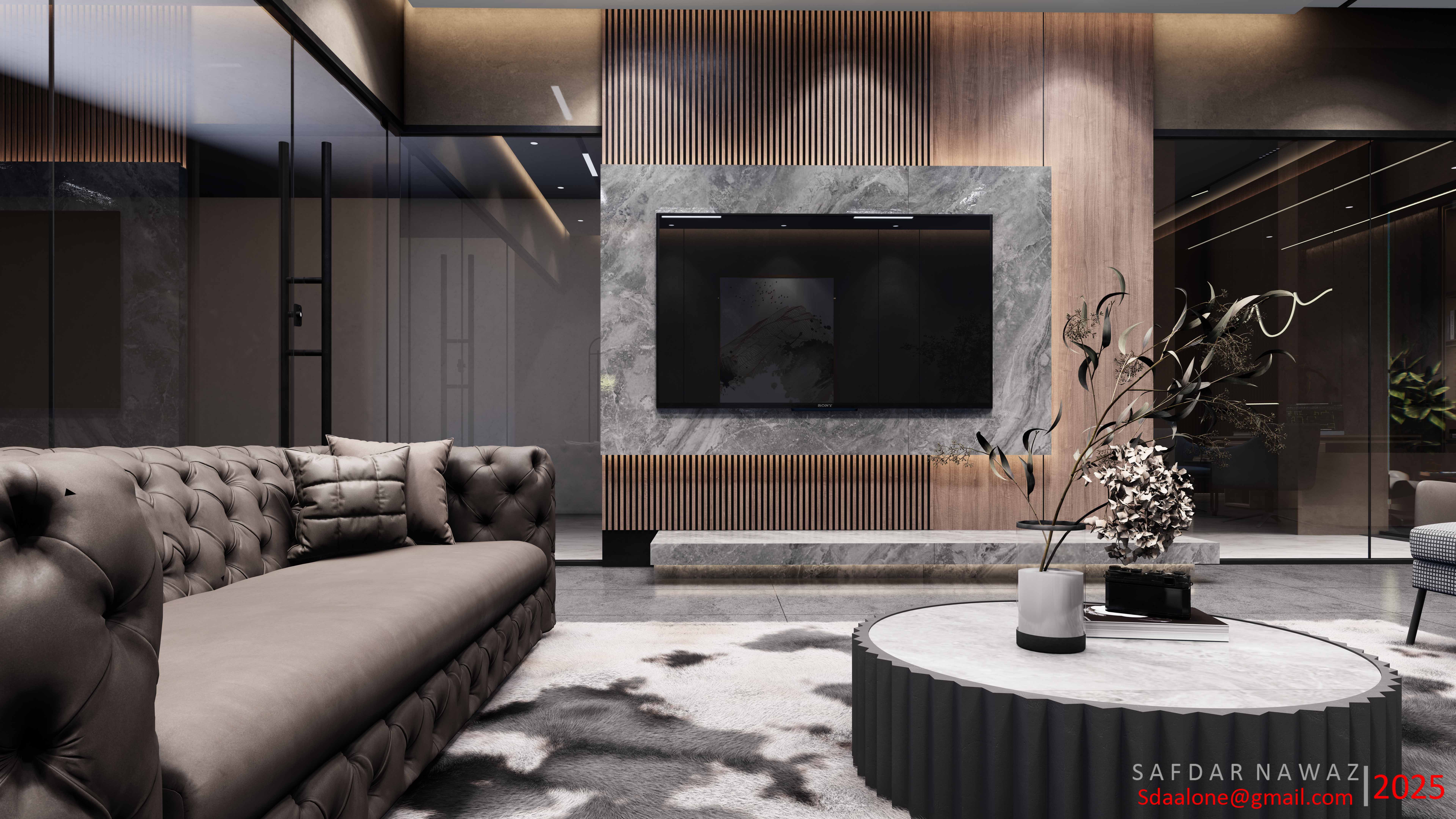 The space features a sleek, dark color palette accented with warm wood tones and metallic details. A custom built-in shelving unit provides ample storage, while comfortable seating and a large desk create a functional and inviting workspace. The strategic use of lighting enhances the overall ambiance. The design reflects a blend of contemporary style and functional elegance.