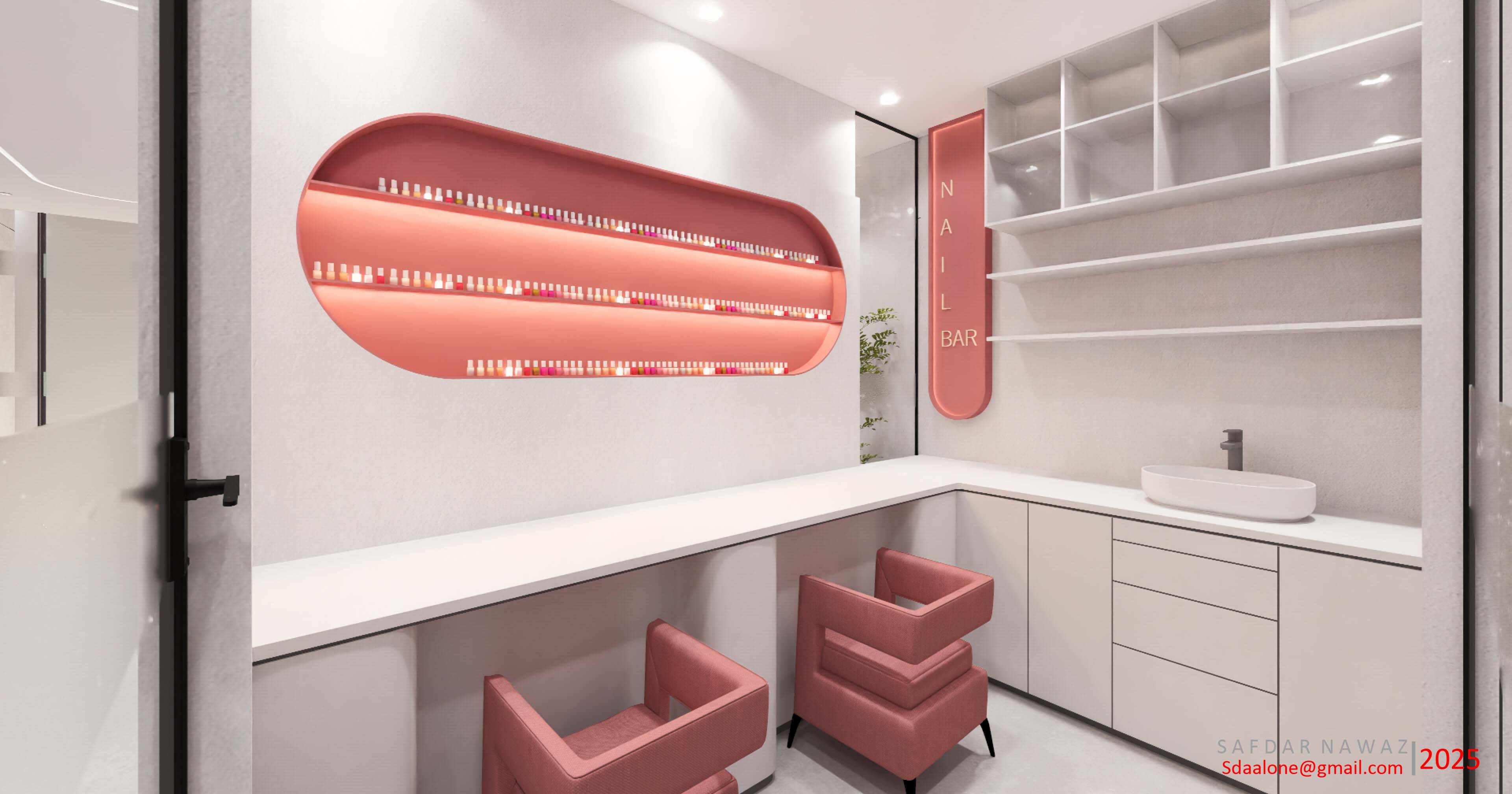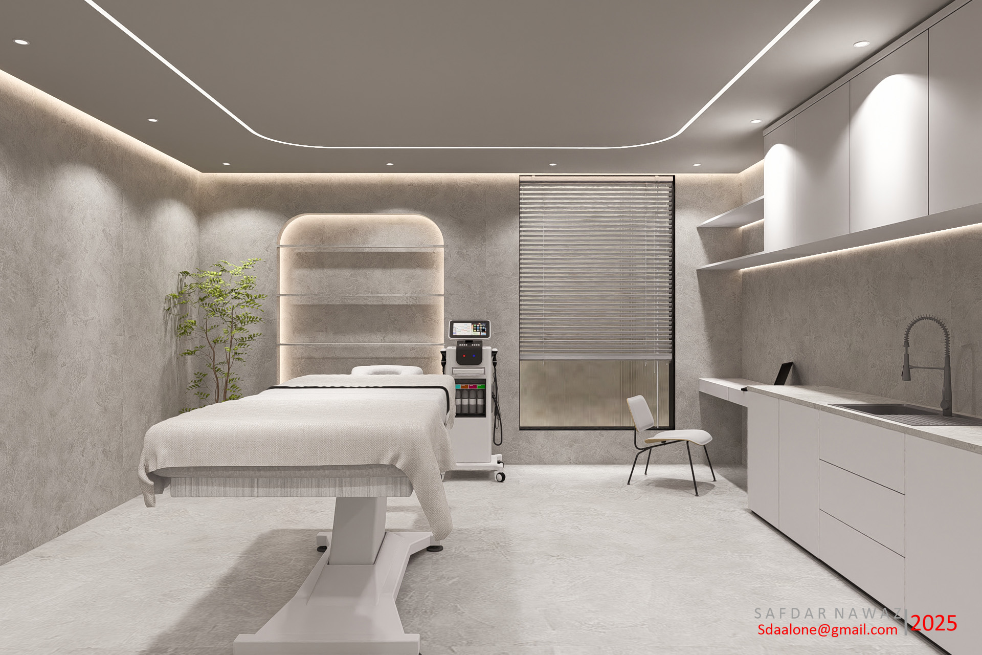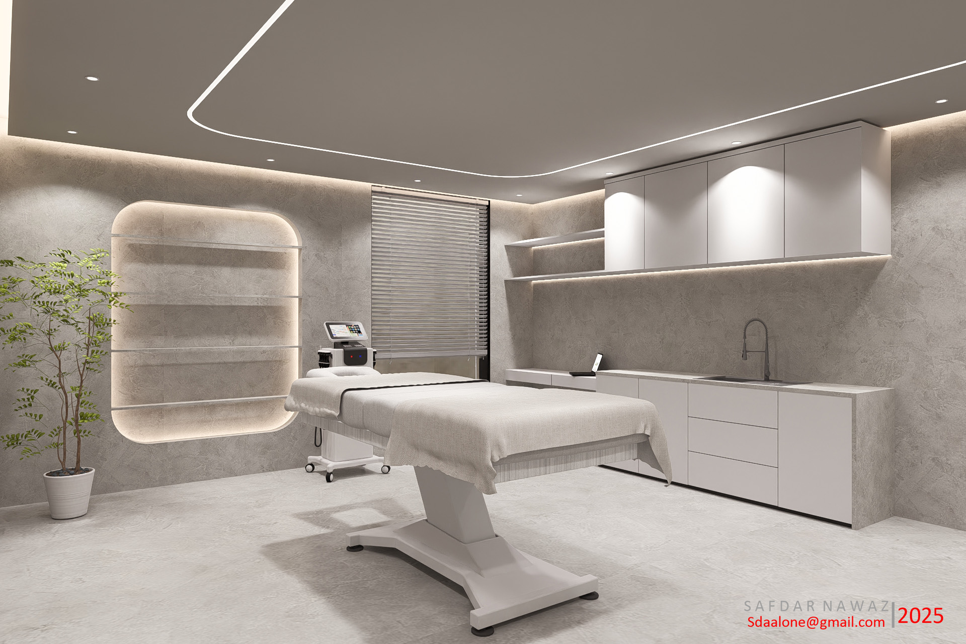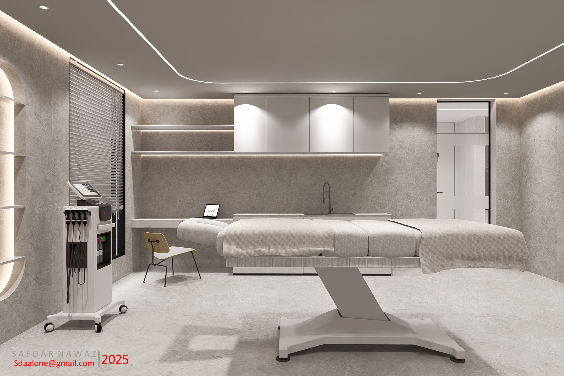 This 3D rendering showcases a contemporary and minimalist design for an aesthetic clinic. The space features clean lines, neutral color palettes (greys and whites), and subtle ambient lighting to create a calming and sophisticated atmosphere for clients. Integrated shelving, modern cabinetry, and a sleek treatment bed highlight the focus on functionality and comfort. The design prioritizes a sense of calm and professionalism, reflecting the high-quality services offered.