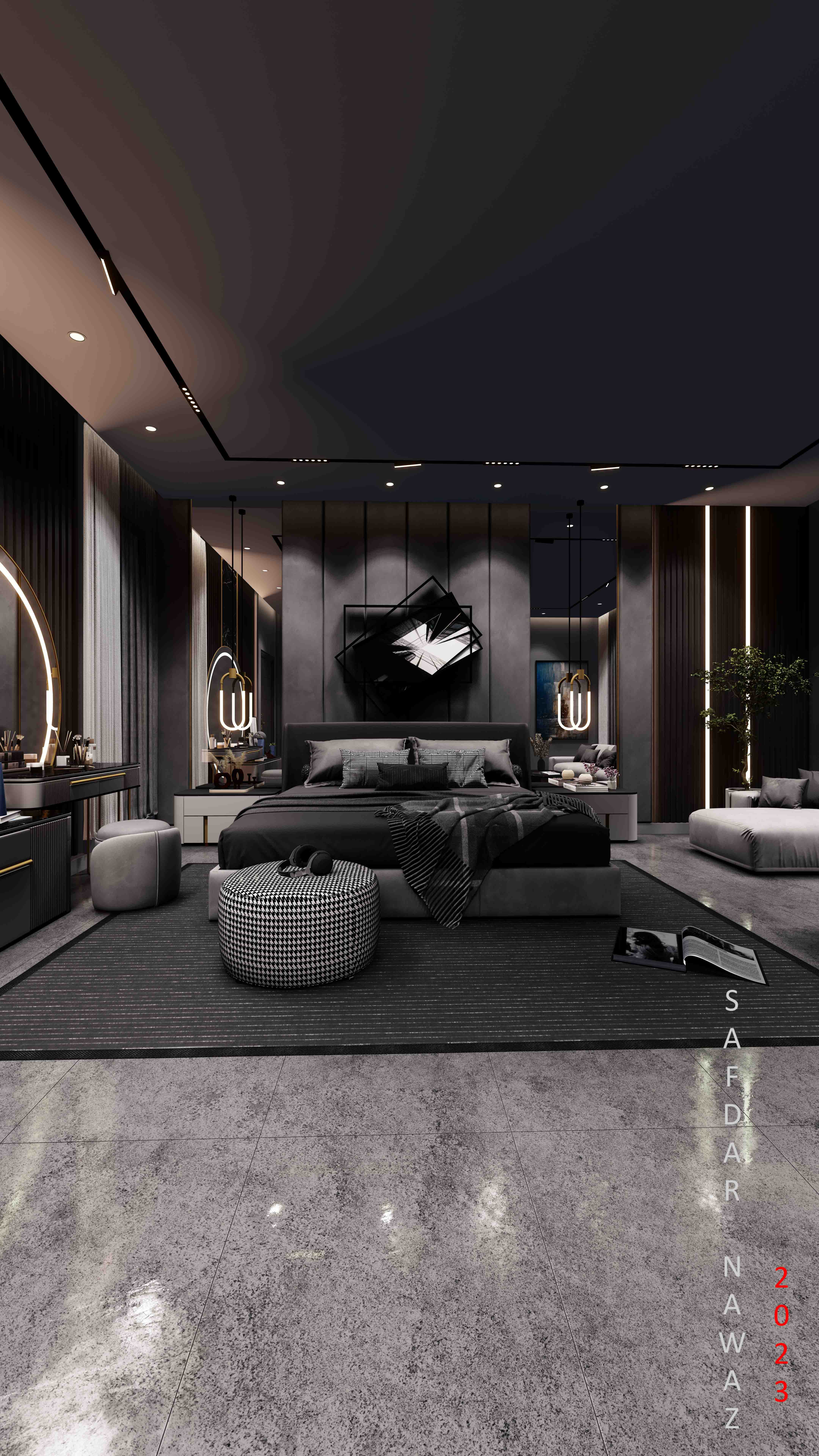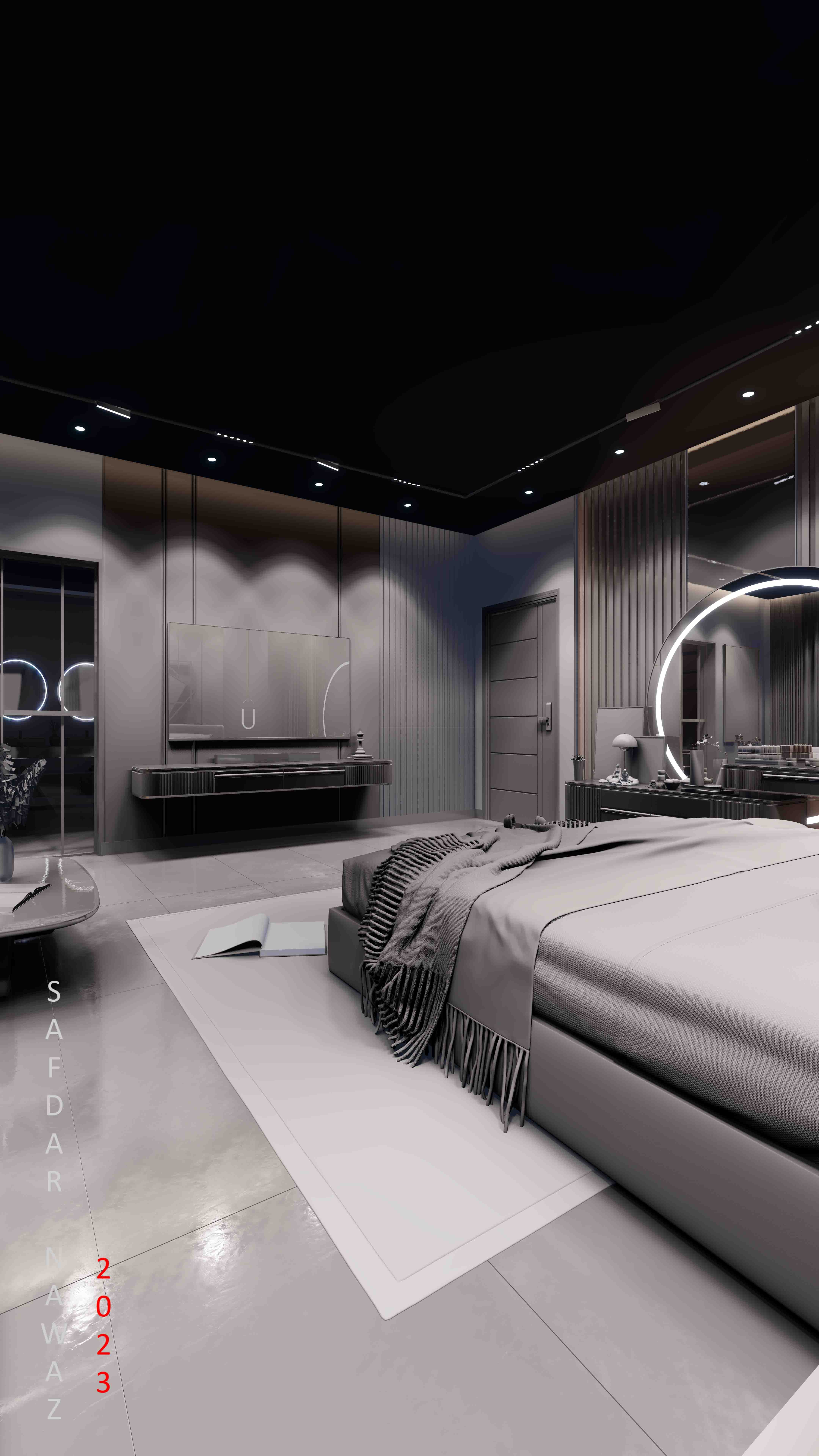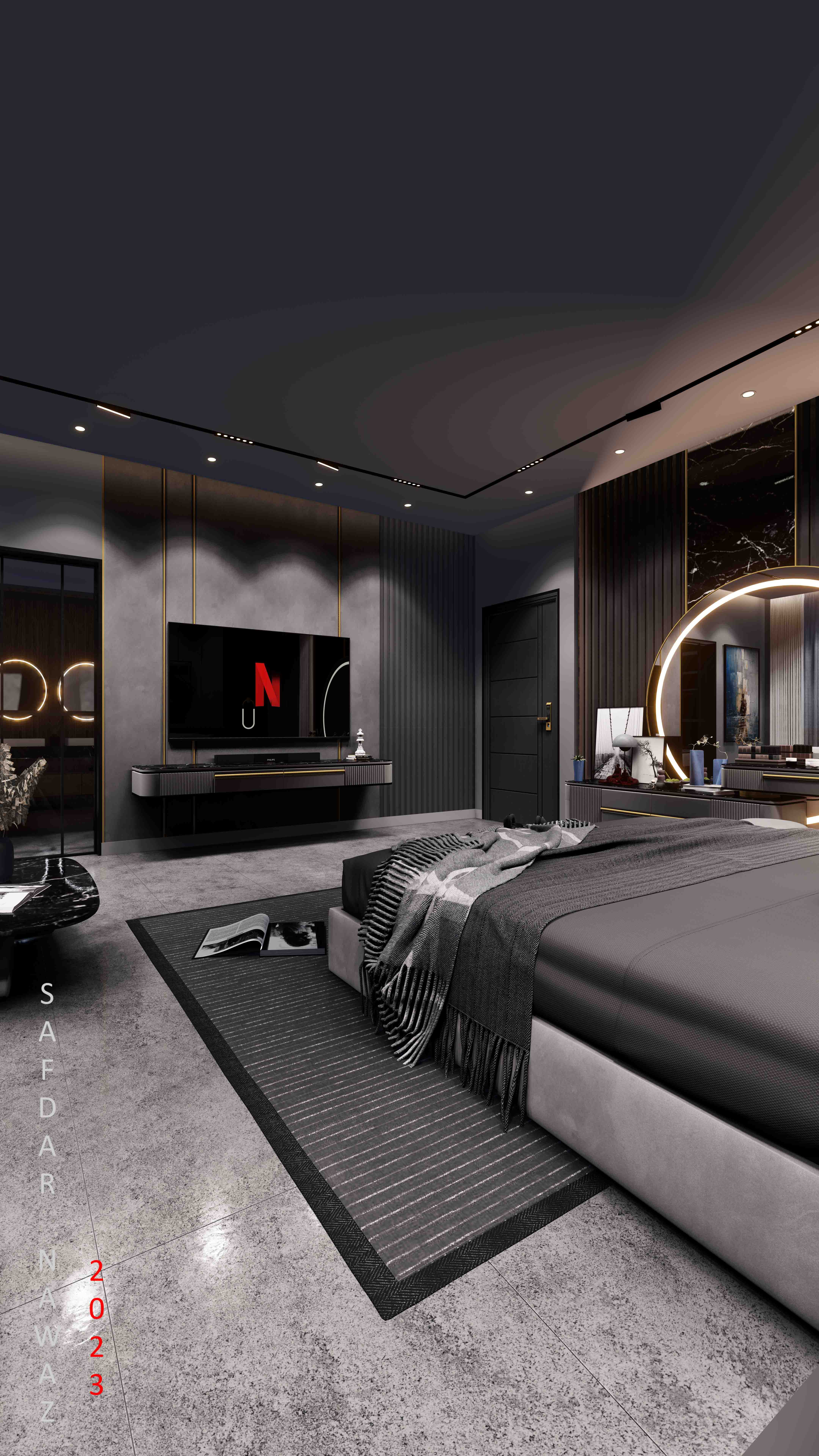 This 3D rendering showcases a luxurious and modern master bedroom. The design emphasizes a monochromatic palette of dark greys and blacks, accented by gold metallic elements. The focal points are a large, dark-grey bed with a textured throw, a sleek entertainment center featuring a TV displaying the Netflix logo, and an illuminated circular mirror in the vanity area. The overall aesthetic is sophisticated and minimalist, creating a tranquil and elegant space. The polished concrete floor and subtle lighting contribute to the room's contemporary feel.