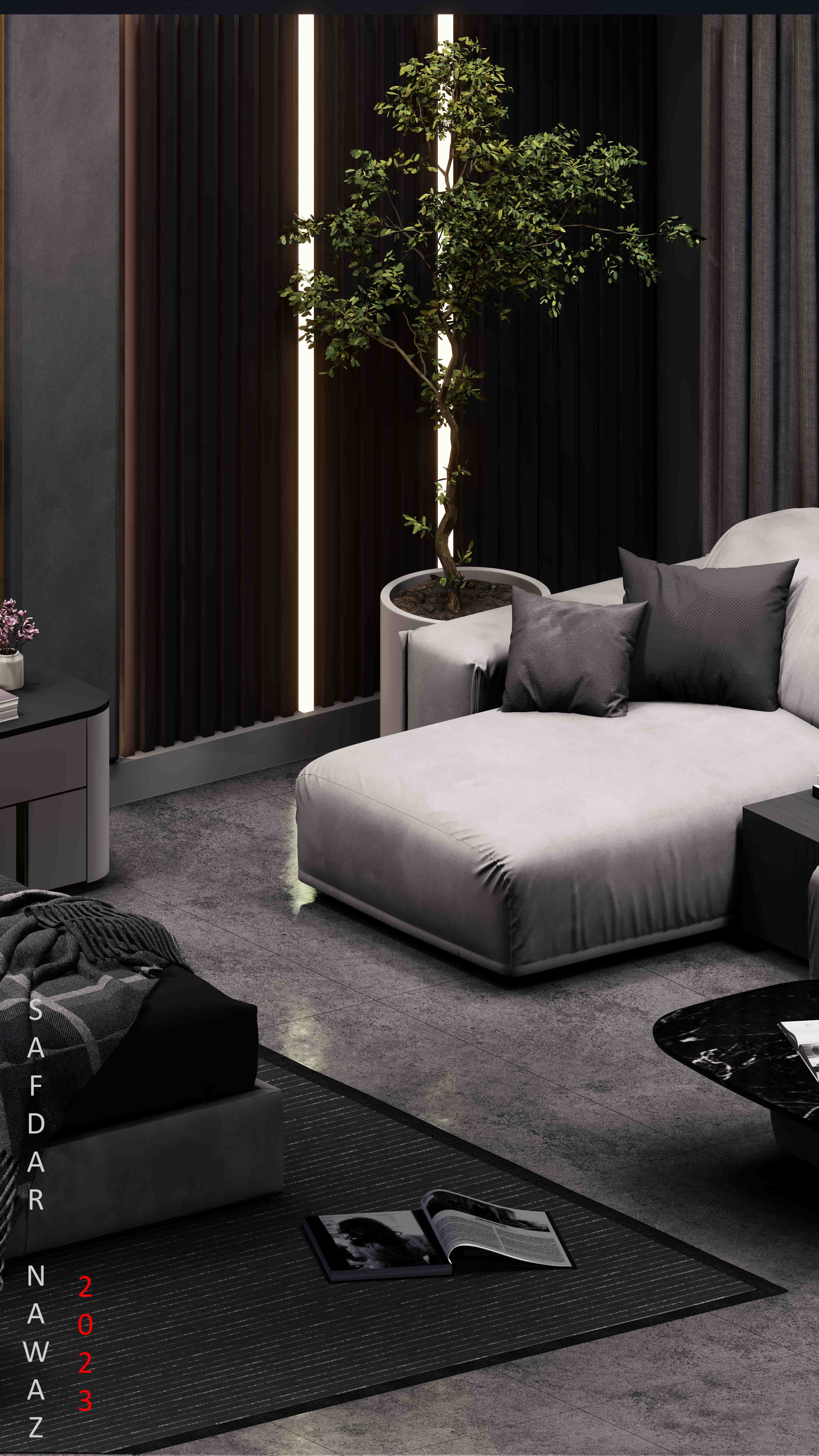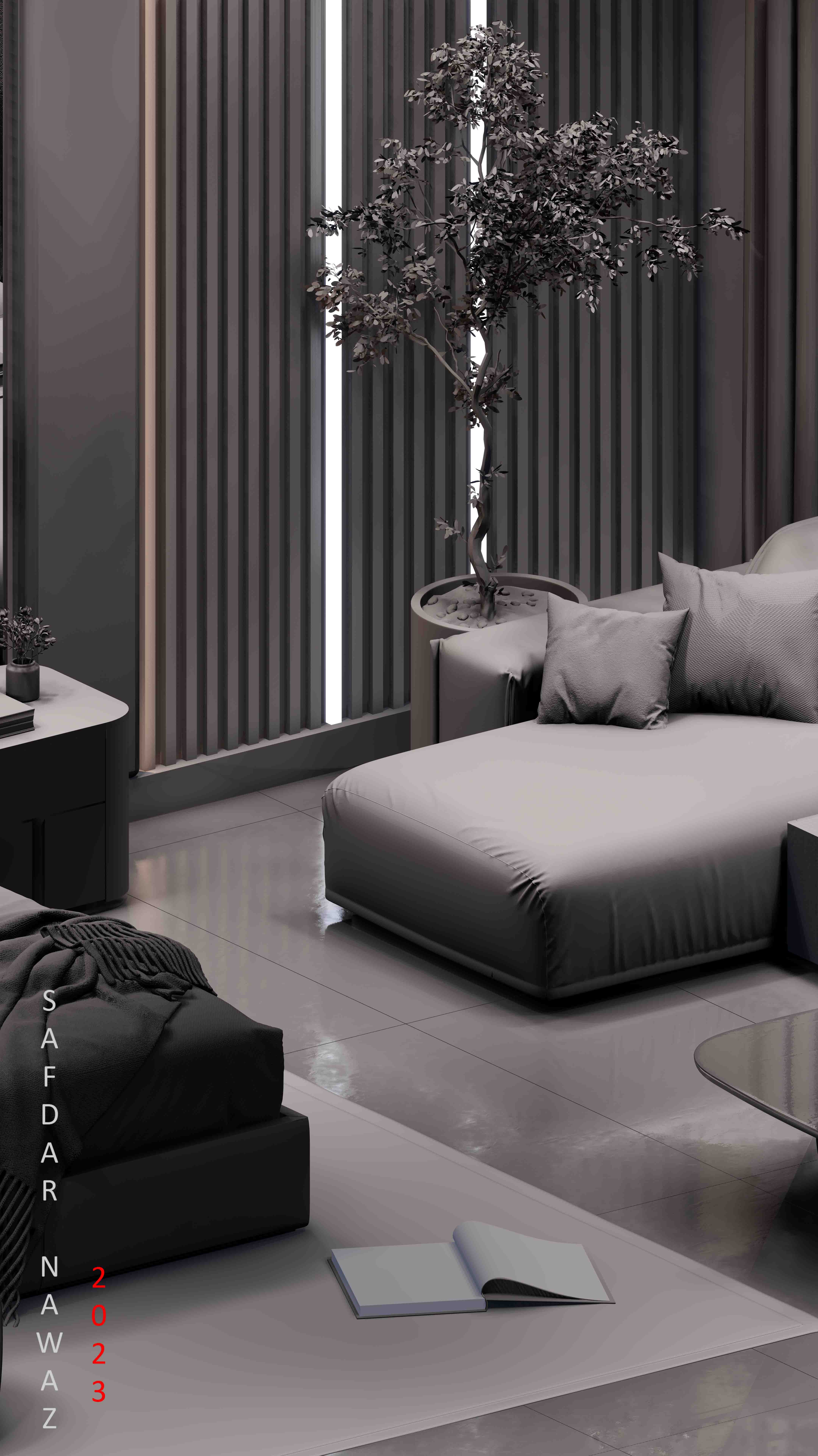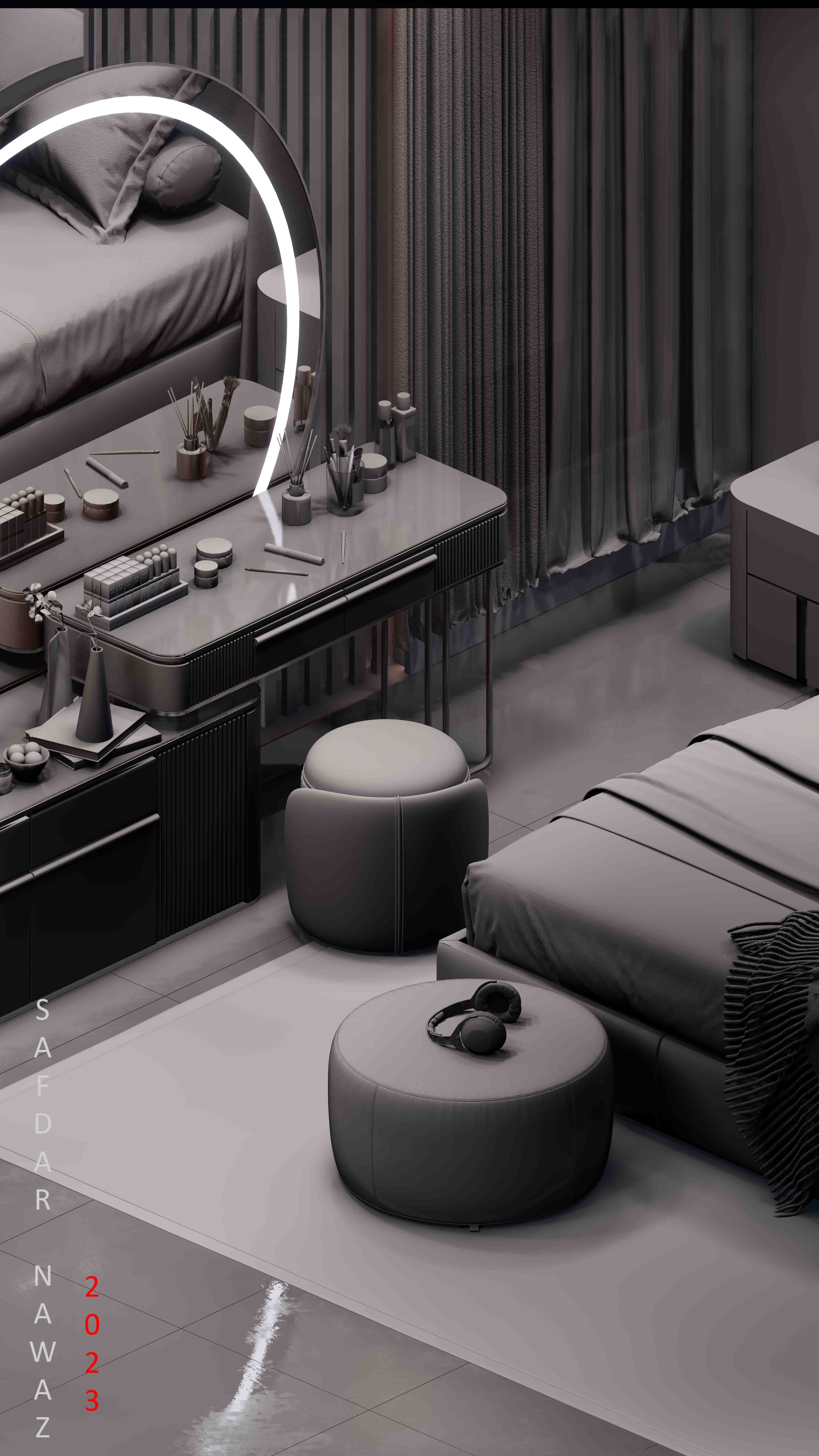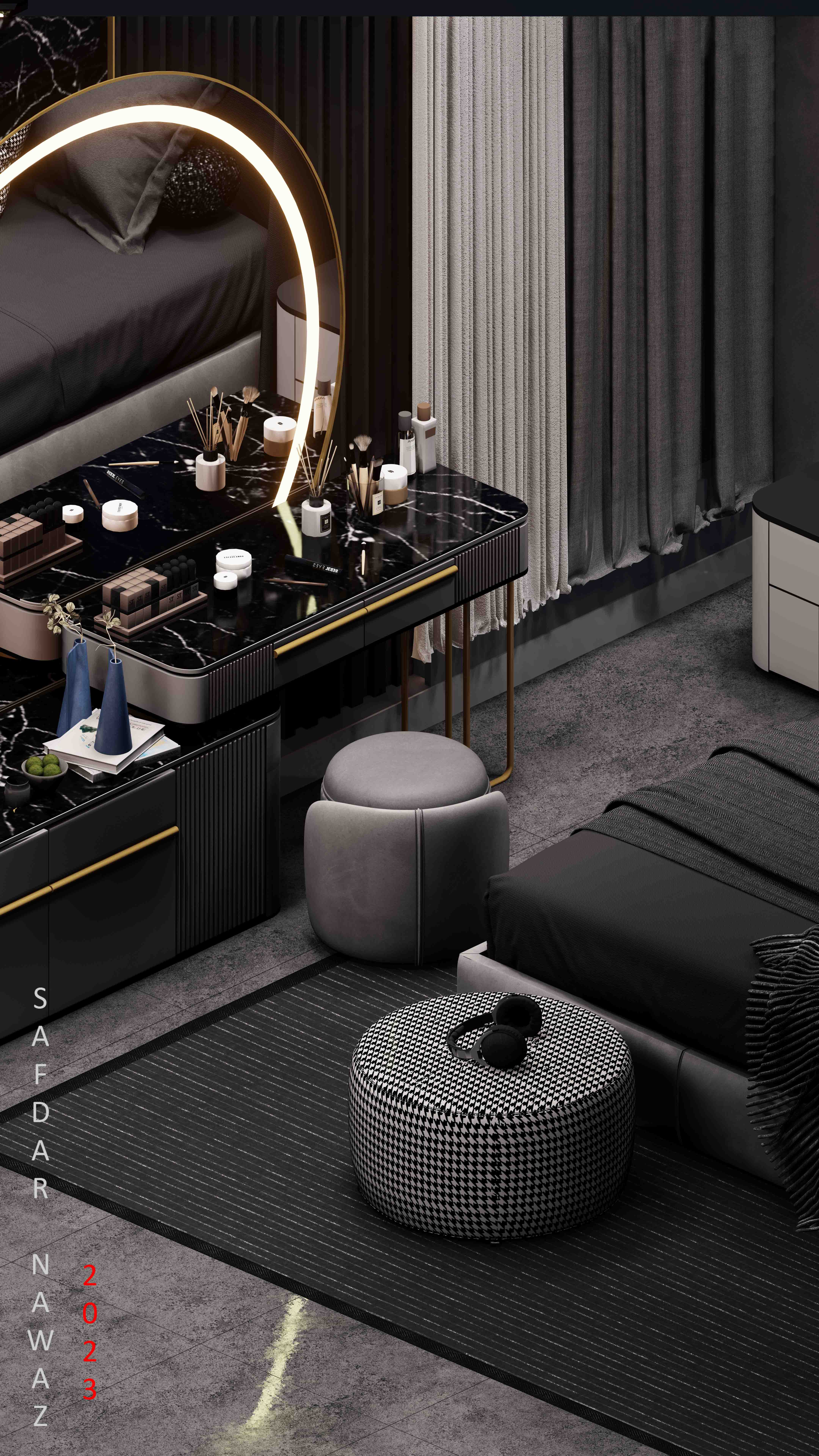 This 3D rendering showcases a luxurious and modern master bedroom. The design emphasizes a monochromatic palette of dark greys and blacks, accented by gold metallic elements. The focal points are a large, dark-grey bed with a textured throw, a sleek entertainment center featuring a TV displaying the Netflix logo, and an illuminated circular mirror in the vanity area. The overall aesthetic is sophisticated and minimalist, creating a tranquil and elegant space. The polished concrete floor and subtle lighting contribute to the room's contemporary feel.