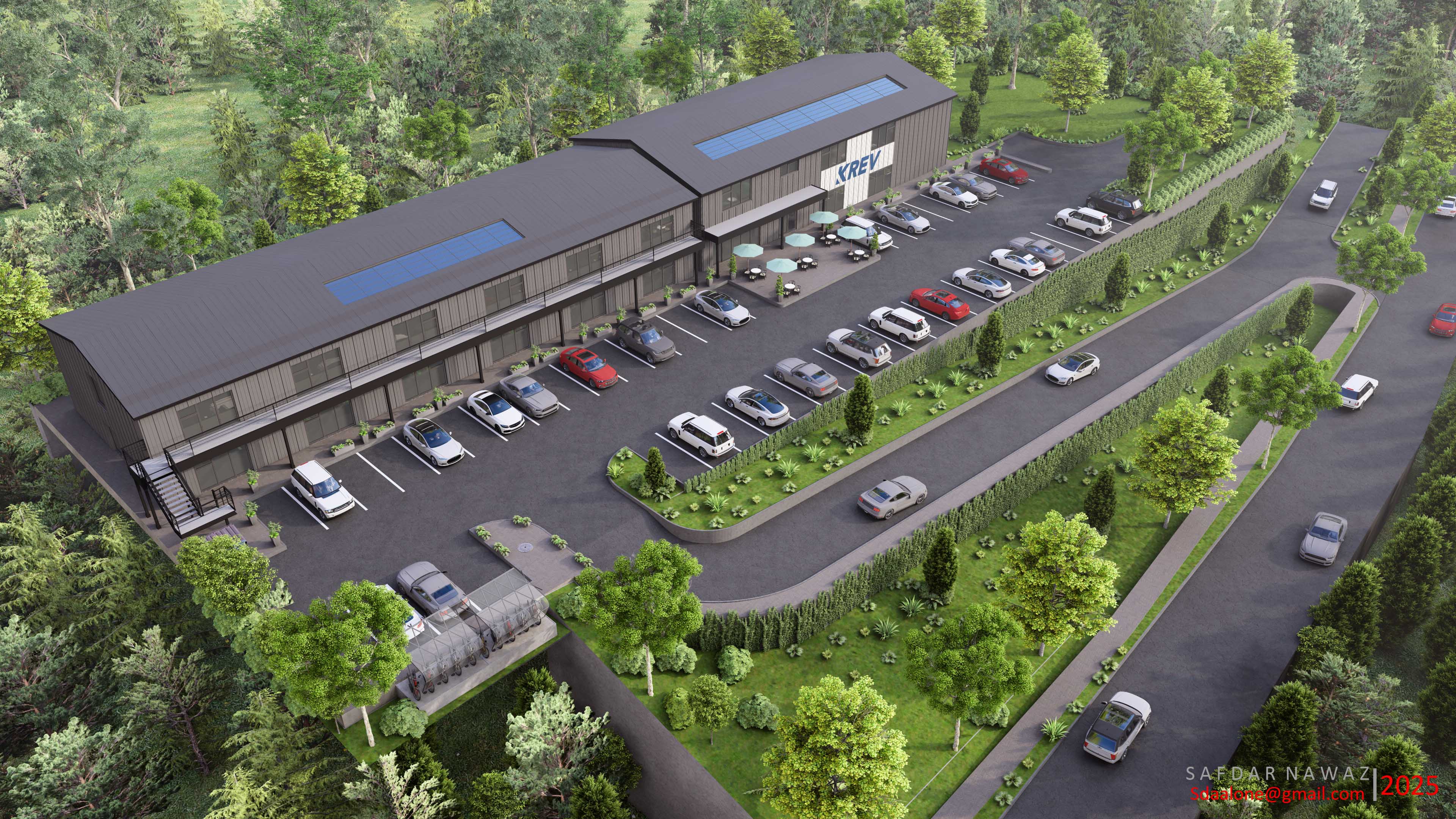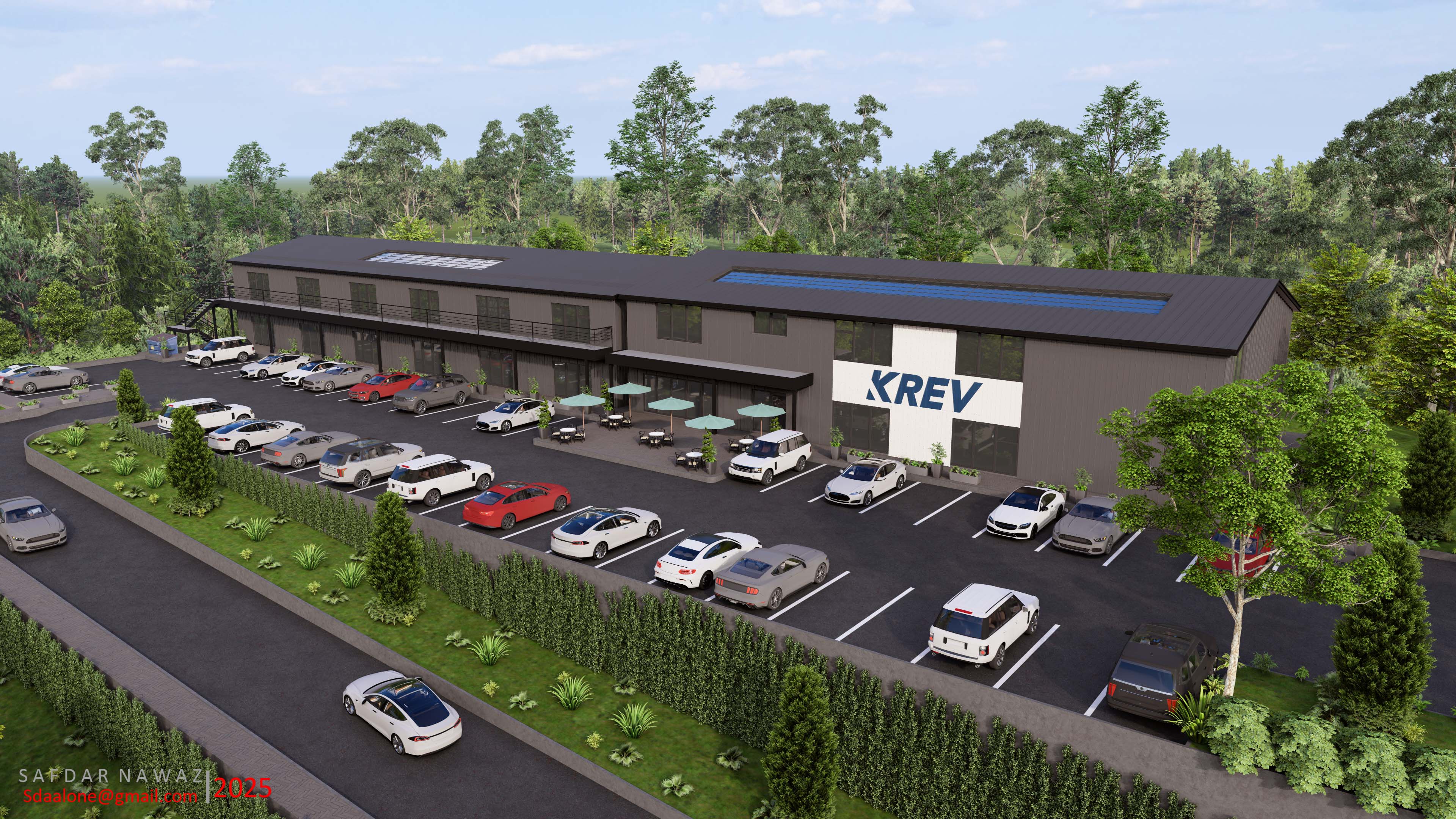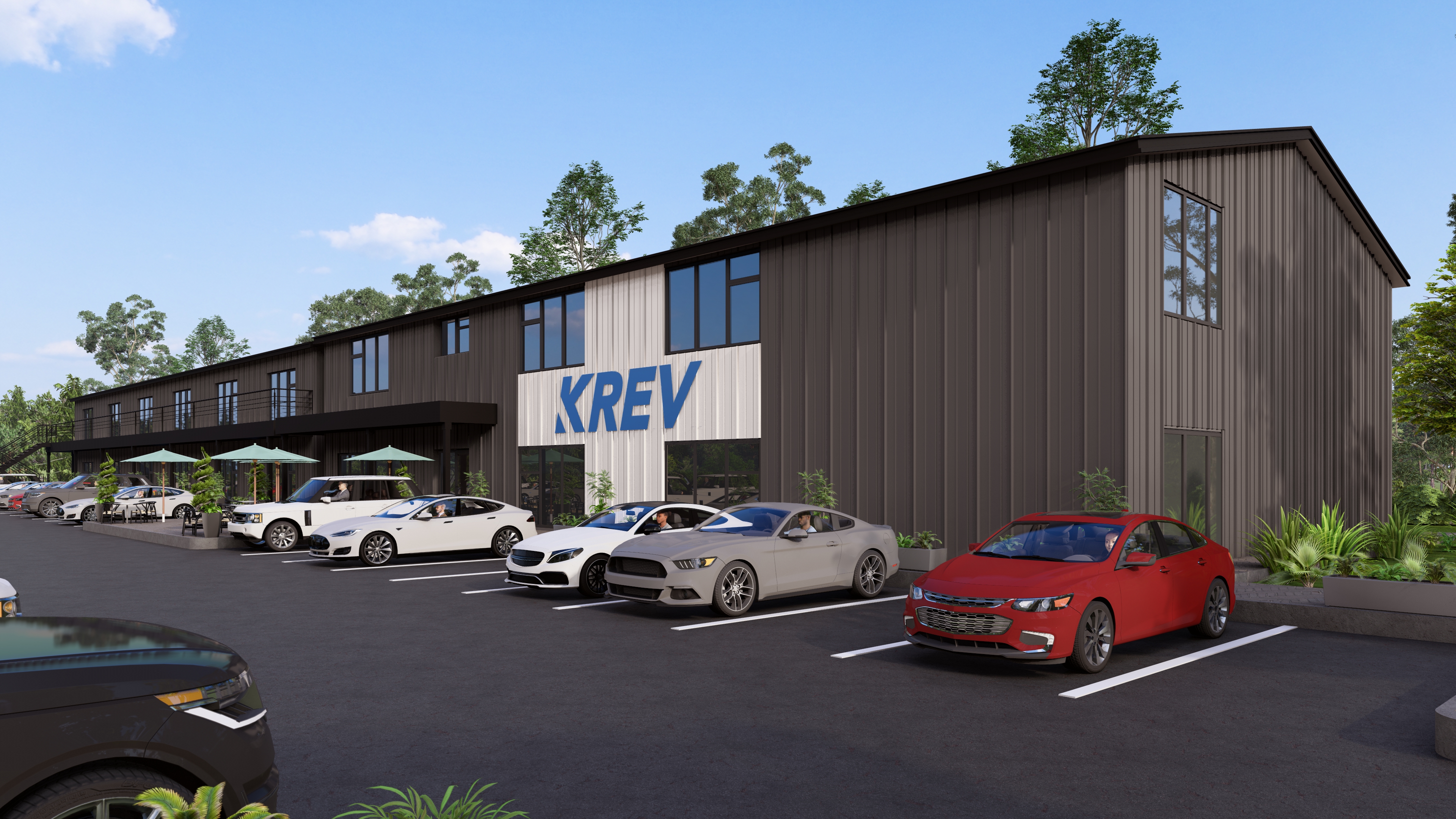 This architectural rendering showcases the proposed KREV facility. The design features a modern, dark-grey building with solar panels integrated into the roof, reflecting a commitment to sustainability. A spacious parking lot is visible, populated with a variety of vehicles, and a landscaped area with neatly trimmed hedges separates the lot from a roadway.