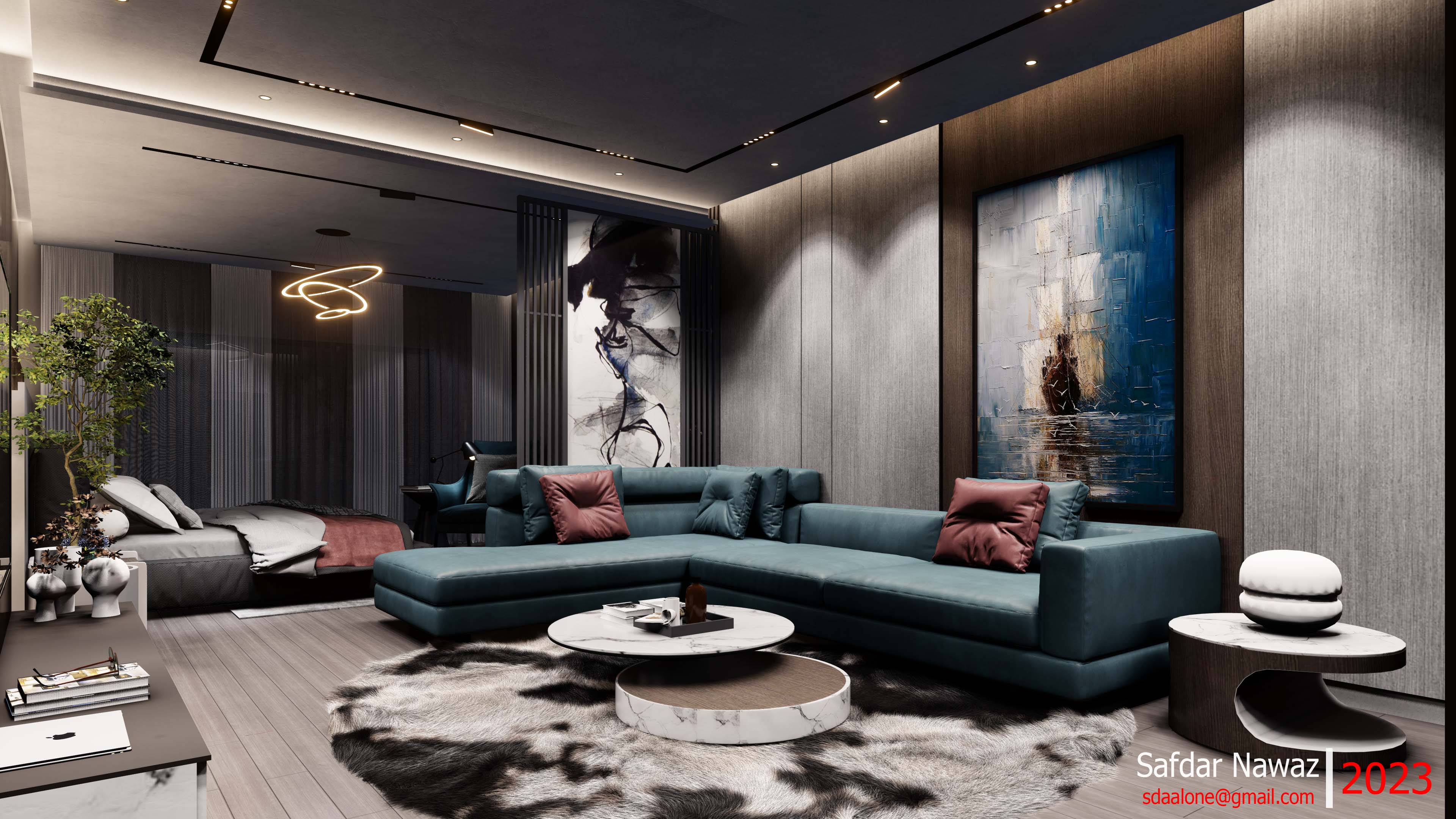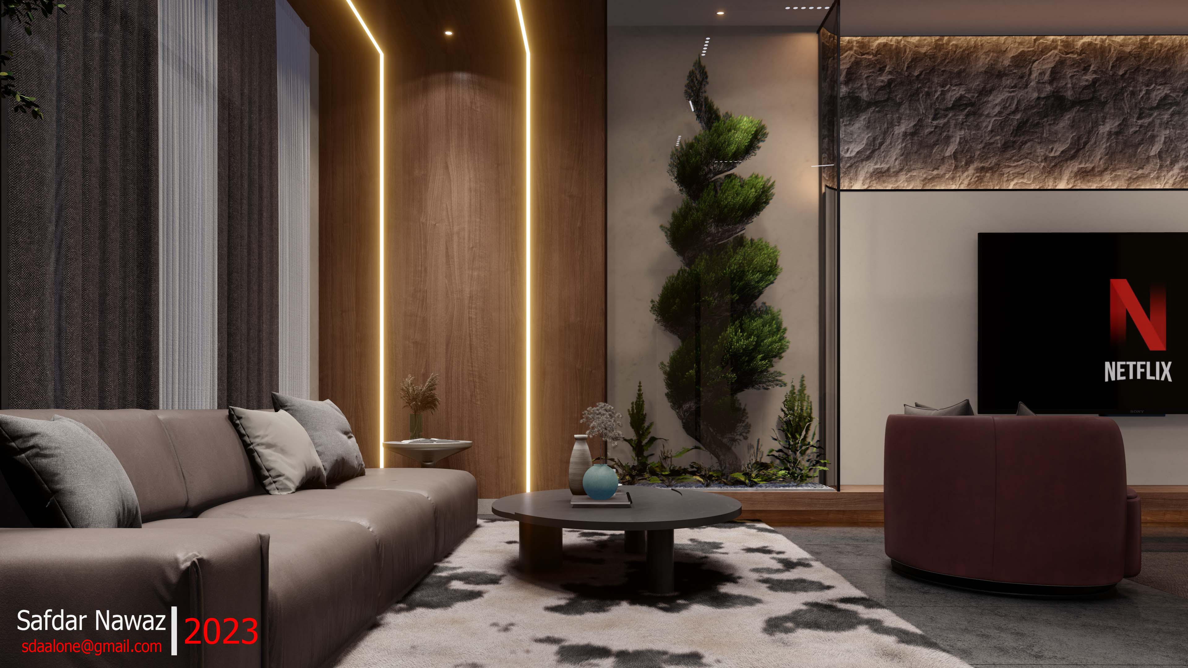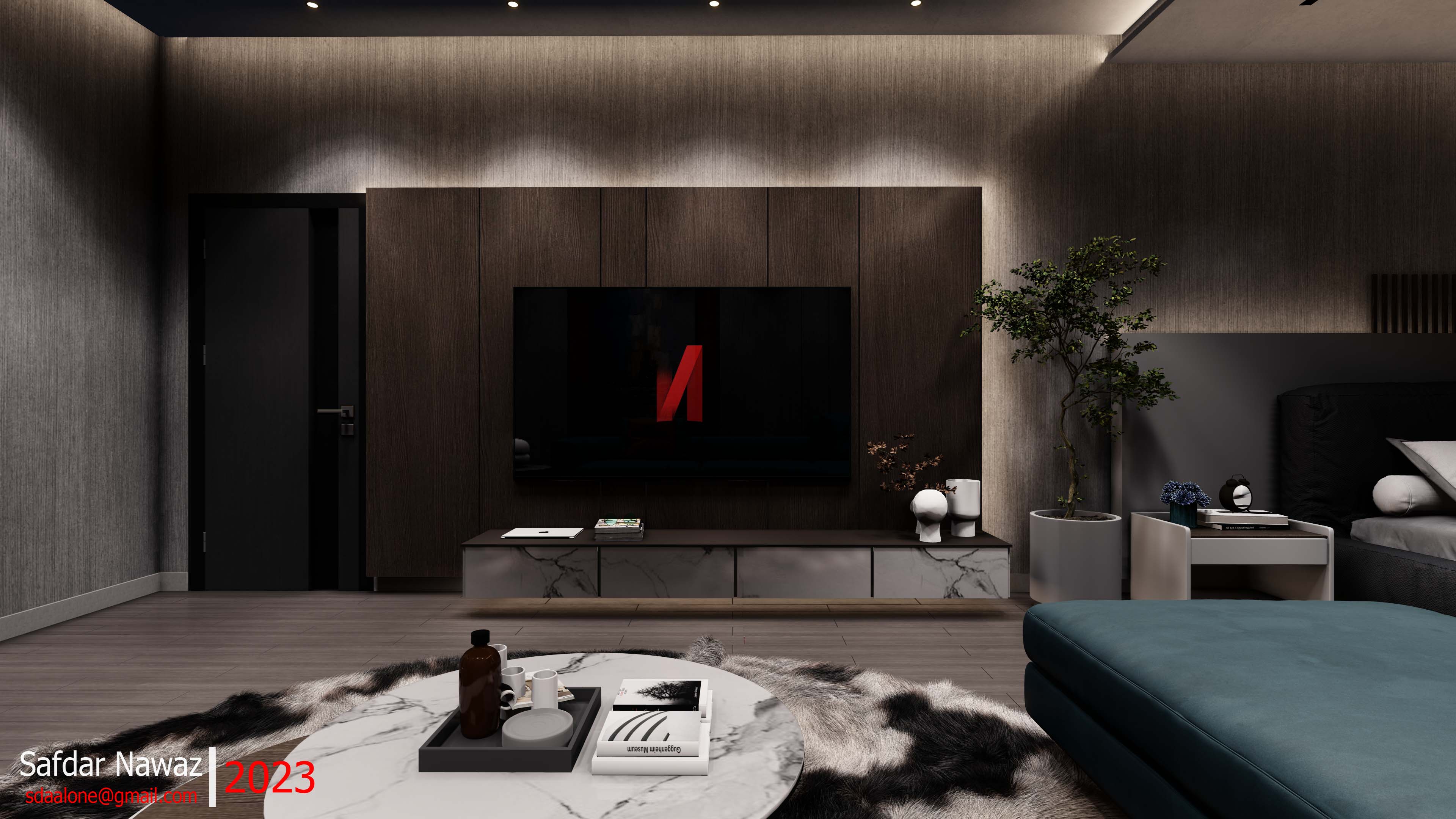 This 3D rendering showcases a sophisticated and minimalist living room design. The space is dominated by a dark wood feature wall incorporating a sleek, flat-screen television. A marble-topped entertainment unit provides ample storage. The color palette is muted, featuring shades of dark gray, brown, and beige, creating a calming and luxurious atmosphere. A faux fur rug adds a touch of texture and warmth. Subtle ambient lighting enhances the overall mood.