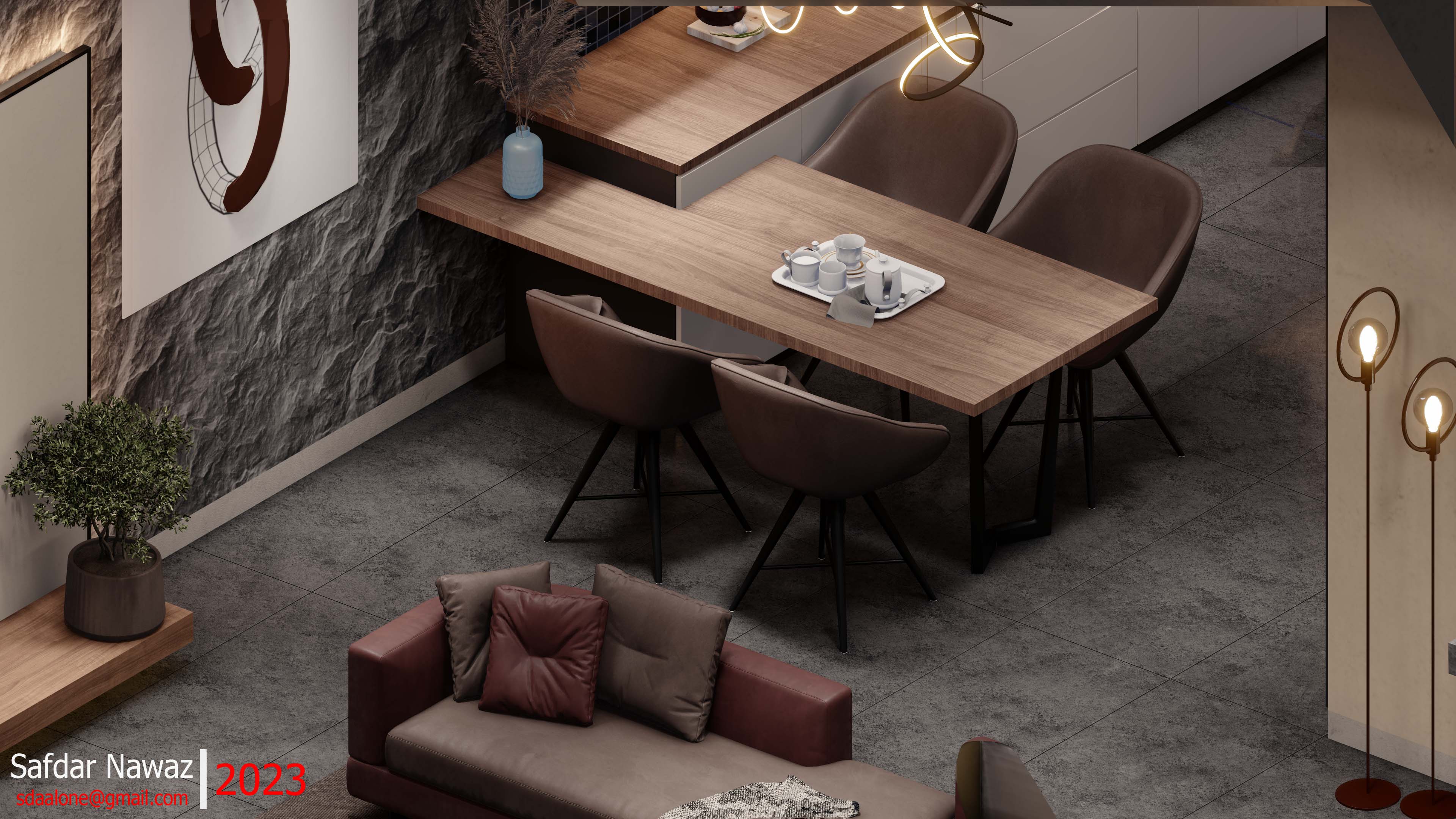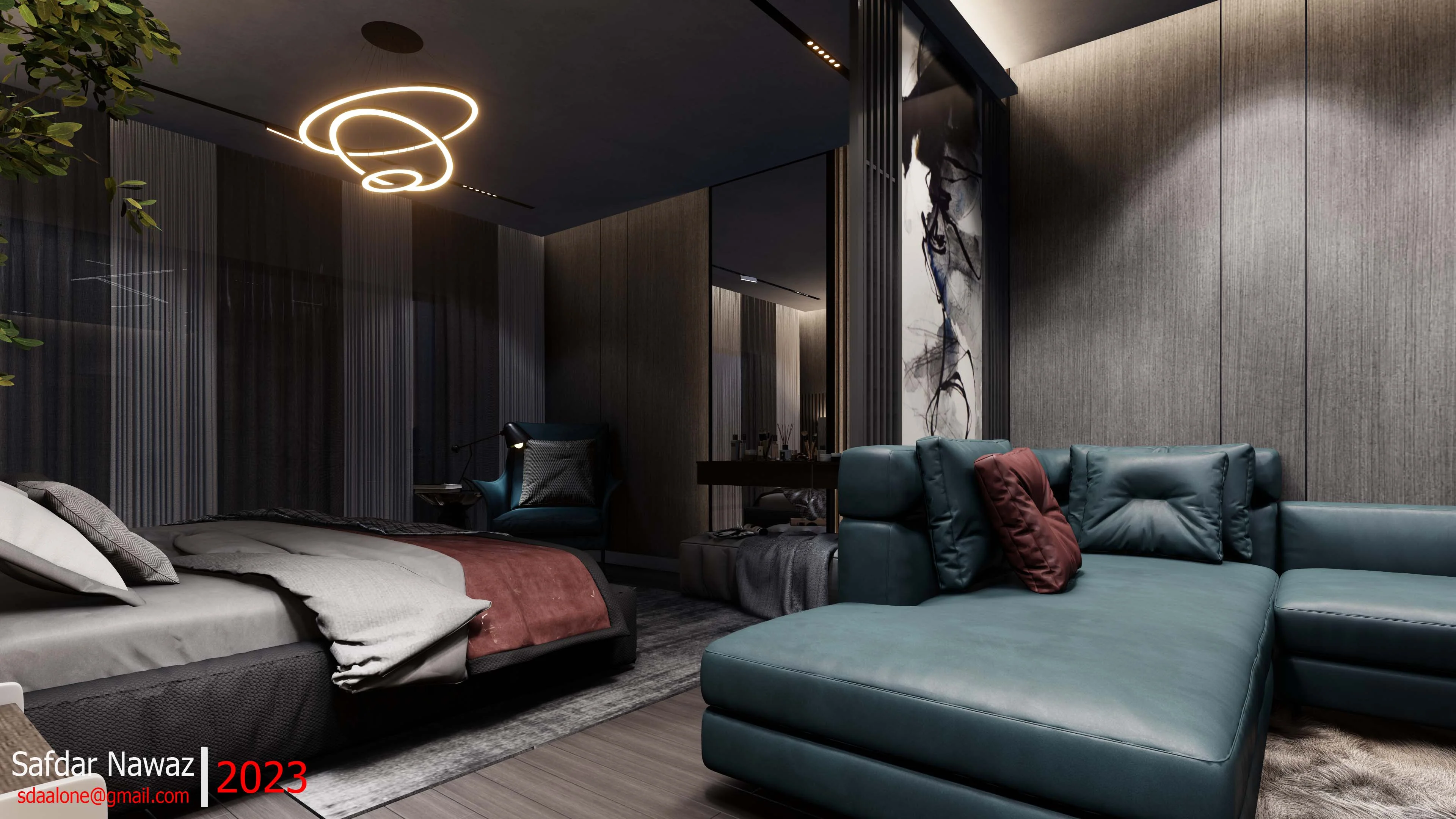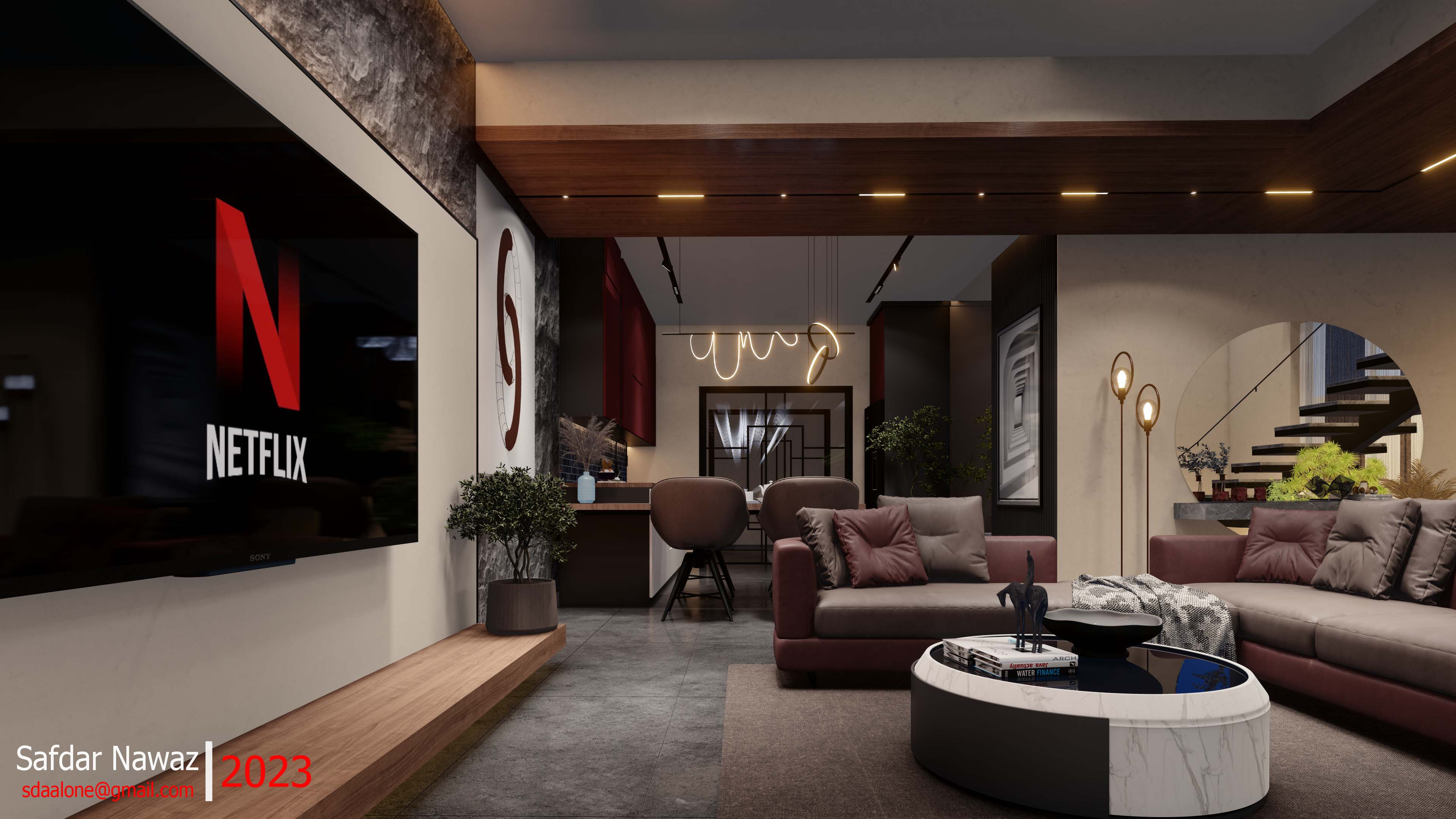 This 3D rendering showcases a sophisticated and minimalist living room design. The space is dominated by a dark wood feature wall incorporating a sleek, flat-screen television. A marble-topped entertainment unit provides ample storage. The color palette is muted, featuring shades of dark gray, brown, and beige, creating a calming and luxurious atmosphere. A faux fur rug adds a touch of texture and warmth. Subtle ambient lighting enhances the overall mood.