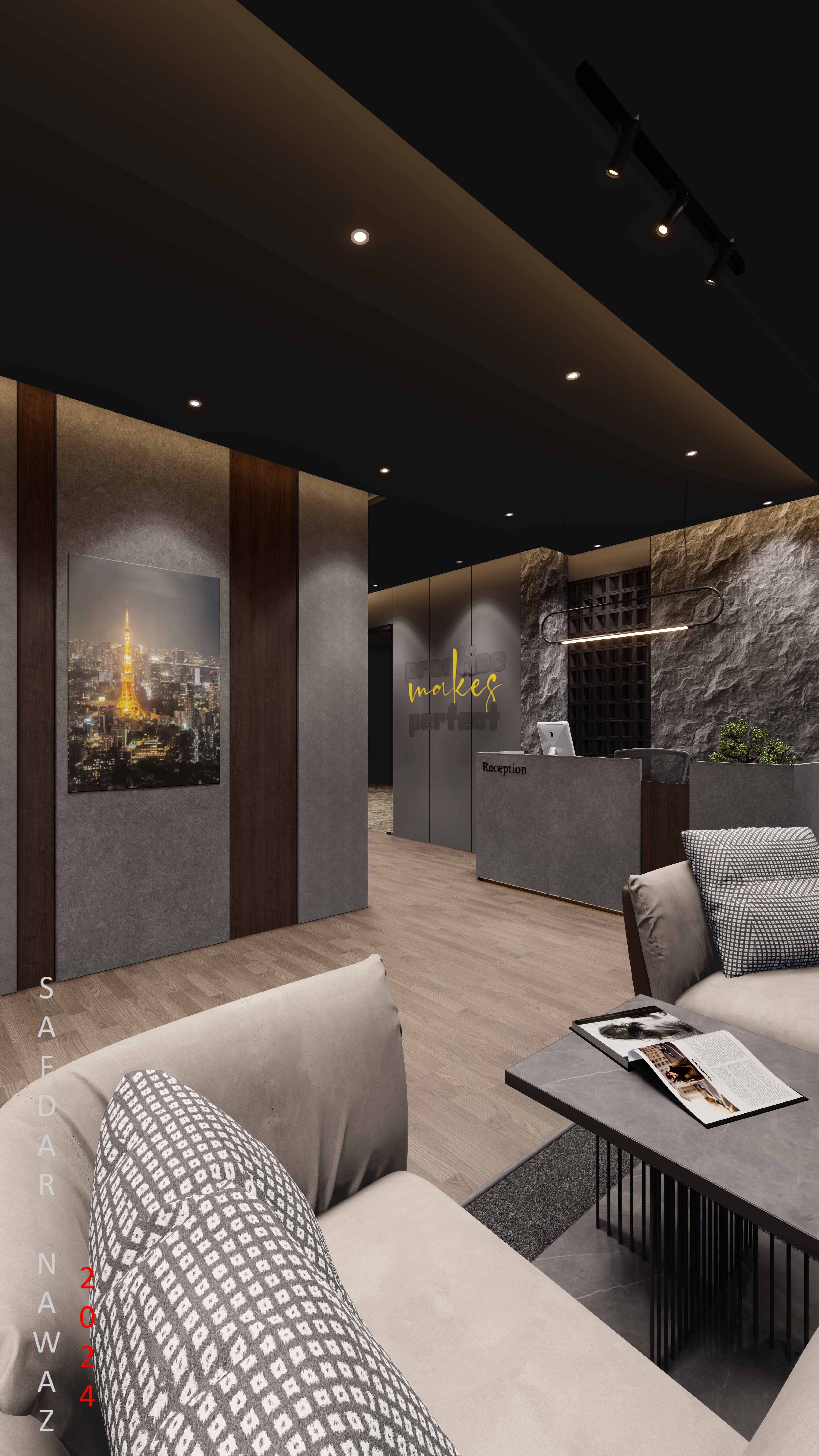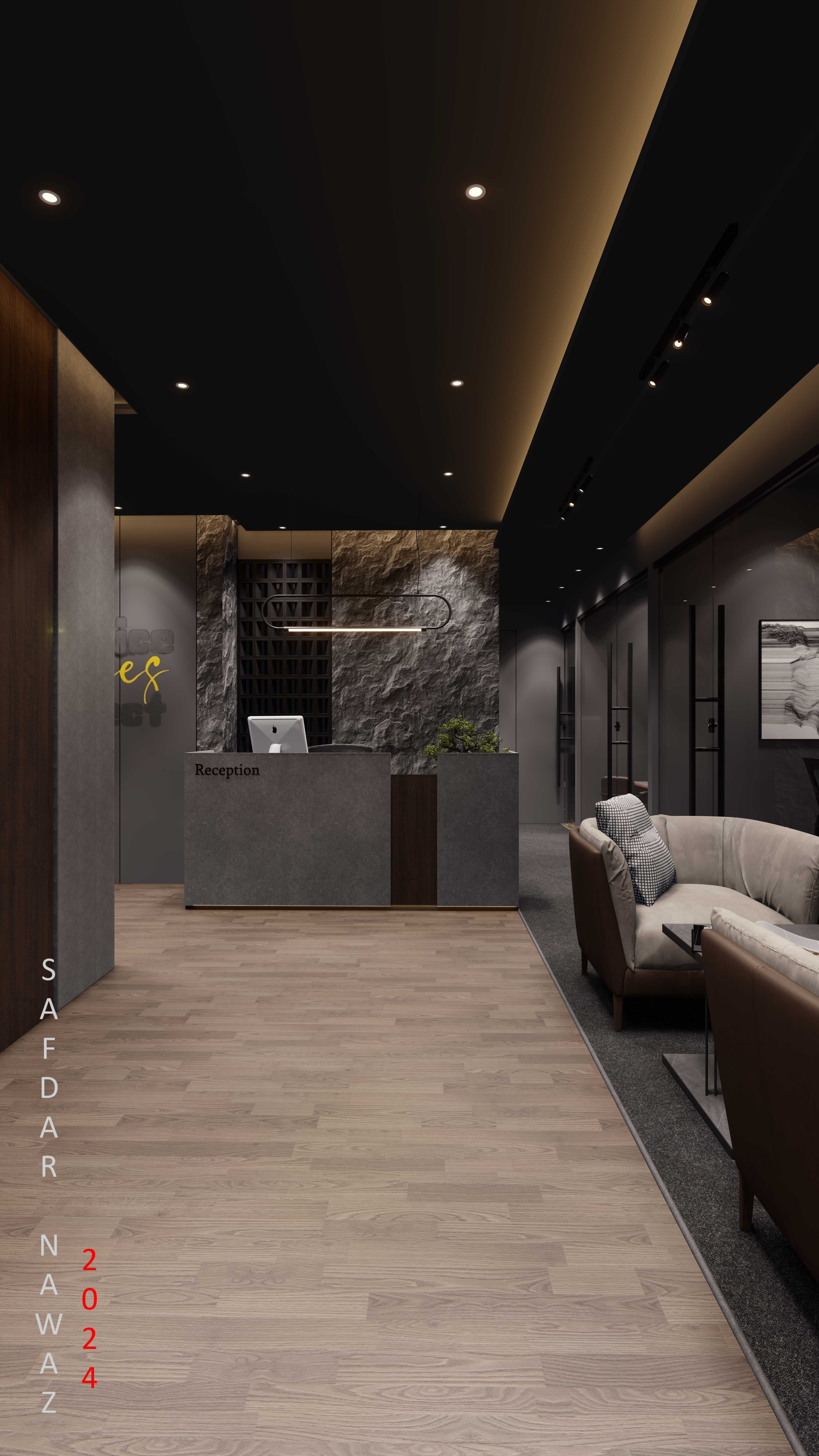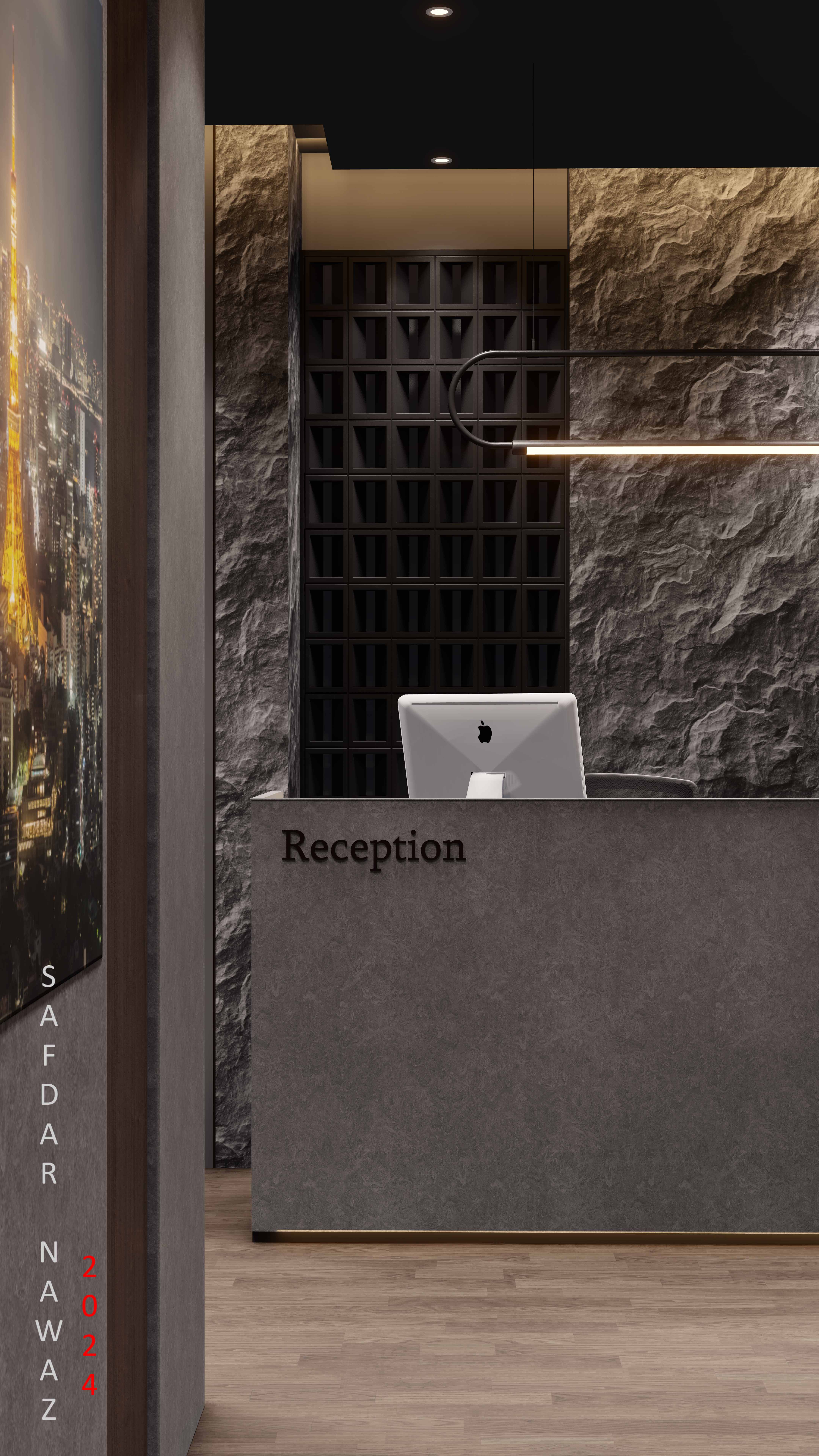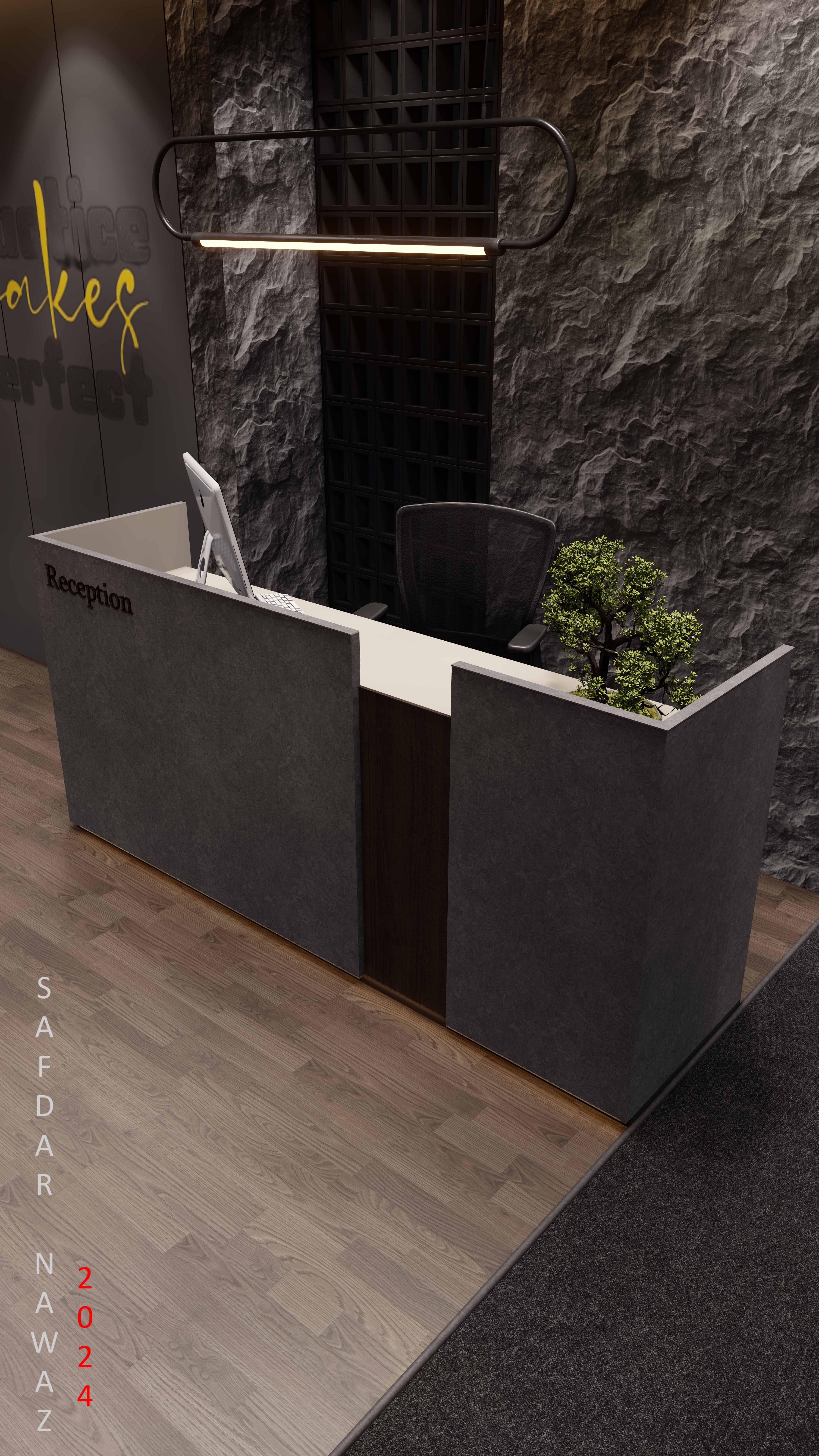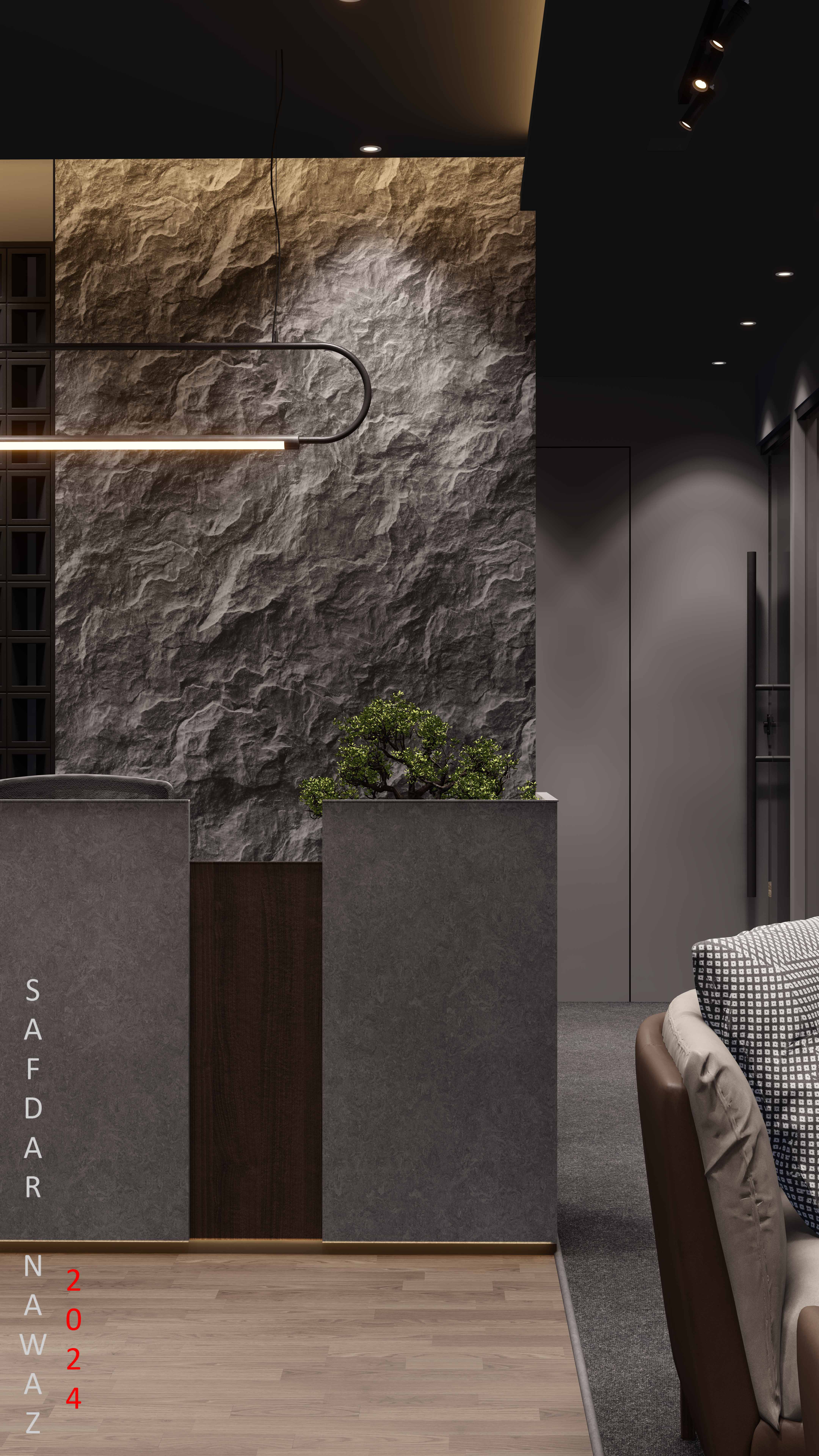 This image showcases a sophisticated and contemporary reception area design. The space is characterized by a minimalist aesthetic, employing a muted color palette of dark grays and browns. The reception desk, constructed from sleek, grey stone-like material, is a central focal point. Its clean lines and simple form complement the overall design ethos. A textured stone wall provides a striking backdrop, adding visual interest and depth. The flooring features light-toned wood laminate, creating a warm contrast against the darker elements.