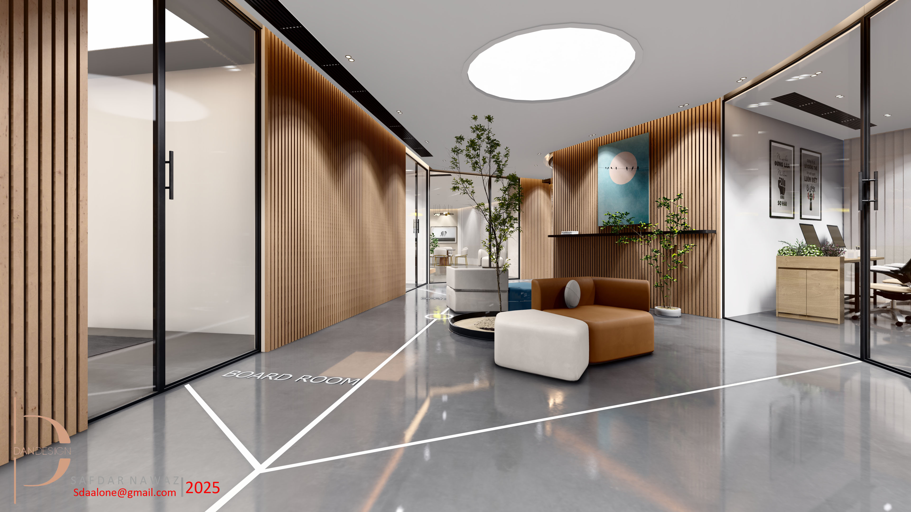 This architectural rendering presents a contemporary and minimalist office lobby design, showcasing a sophisticated blend of natural wood, sleek glass partitions, and calming neutral tones. The space features a strategically placed seating area with a modular corner sofa and ottoman, ideal for informal meetings or quiet contemplation. Directional floor markings clearly delineate the pathway to the boardroom, enhancing the space's functionality and user-friendliness.